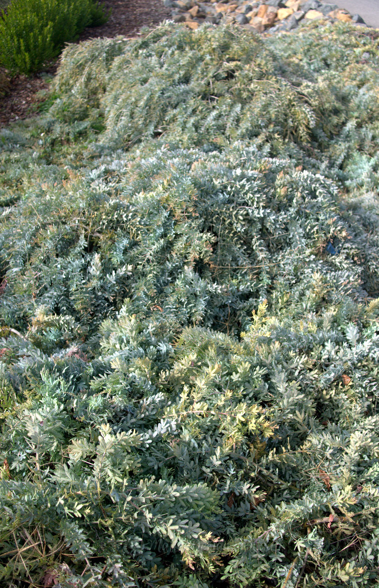 Acacia baileyana Prostrate is a low growing ground cover form of the Cootamundra Wattle, unlike its parent it does not have a weed capacity. It grows well on the East Coast and handles the humid summers OK as long as you keep your eye out for scale.