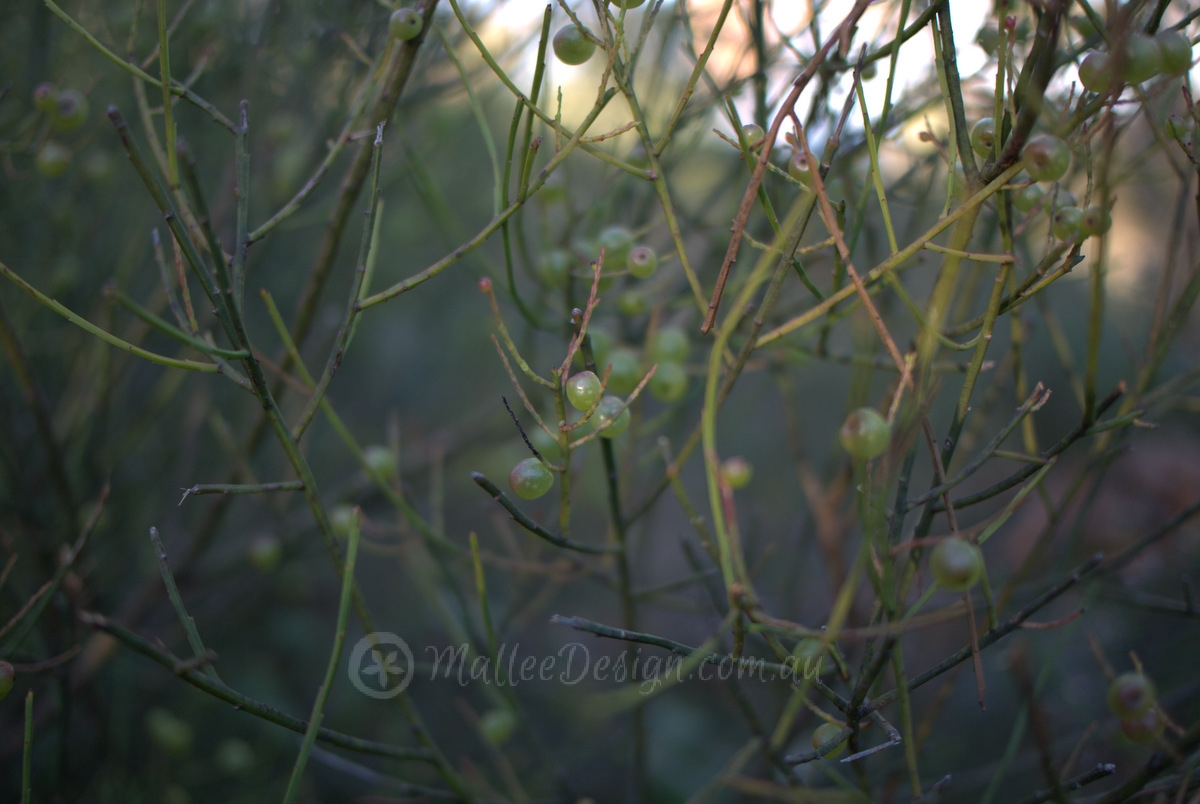Leptomeria acida is a root parasite that grows in dry sclerophyll forest in coastal areas along the NSW coastline, it appears to be a leafless plant that grows to between 1 and 3 metres high and wide. The true leaves have degenerated to microscopic scales making it resemble the leaves you find on Casuarinas and Callitris. The fruits contain reasonable levels of vitamin C and appear from winter through to spring. The common name of bush currant was widely used as the small fruits are about the size of a currant and the first Pioneers used them in the same way by making wild Currant Jelly.