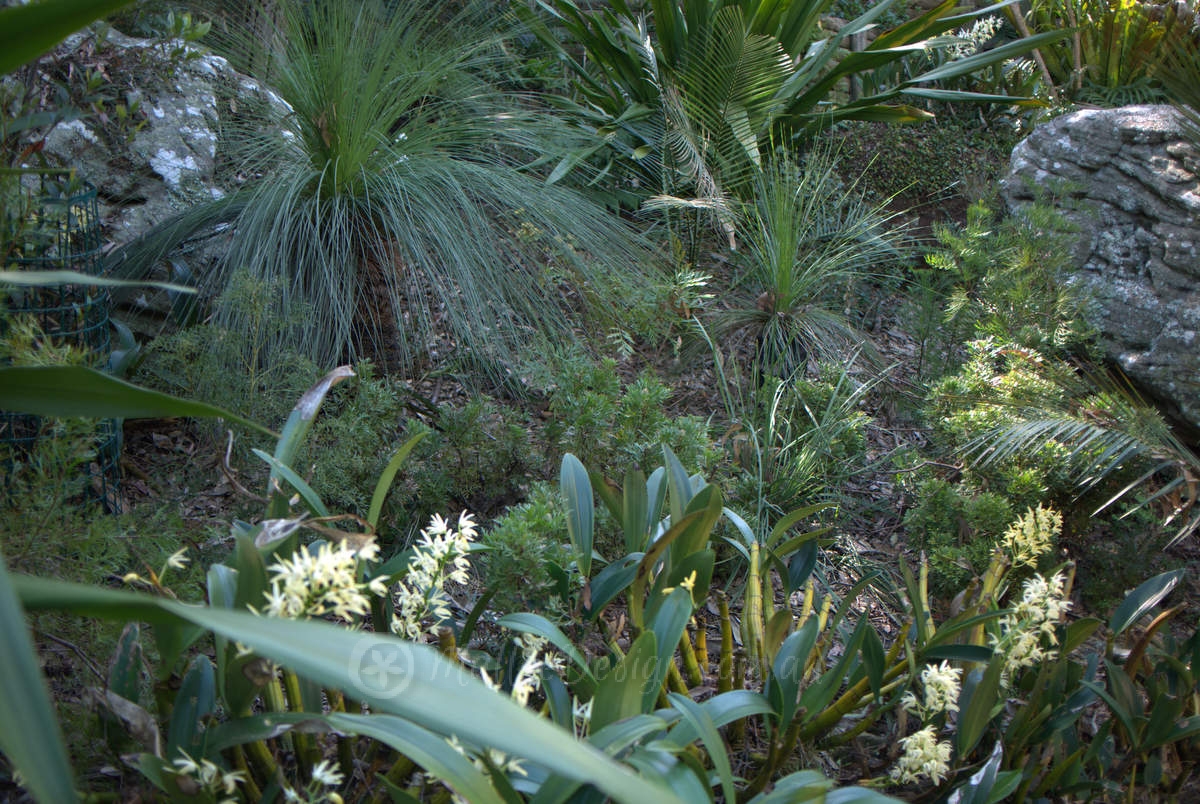 Below you can see an excellent example of a shady garden bed planted with an excellent plant selection. There are Xanthorrhoea spps., Lomatia silaifolia, Macrozamia communis and Doryanthes excelsa.
