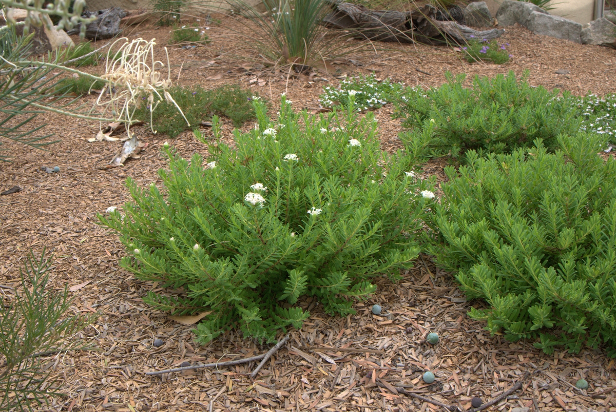 This is a low growing form of Pimelea linifolia called ‘White Jewel’, it has proven itself to me to be very hardy and versatile. One of the main reasons I like using this plant is its shape, it grows into a thick luscious looking mound about 30cmHigh x 60cmWide which has the appearance of having just been pruned into shape. Therefore it lends itself to be both a ground cover and an edging plant and also a great small feature plant, that flowers year round, here you can see it planted in groups to mimic a larger plant.