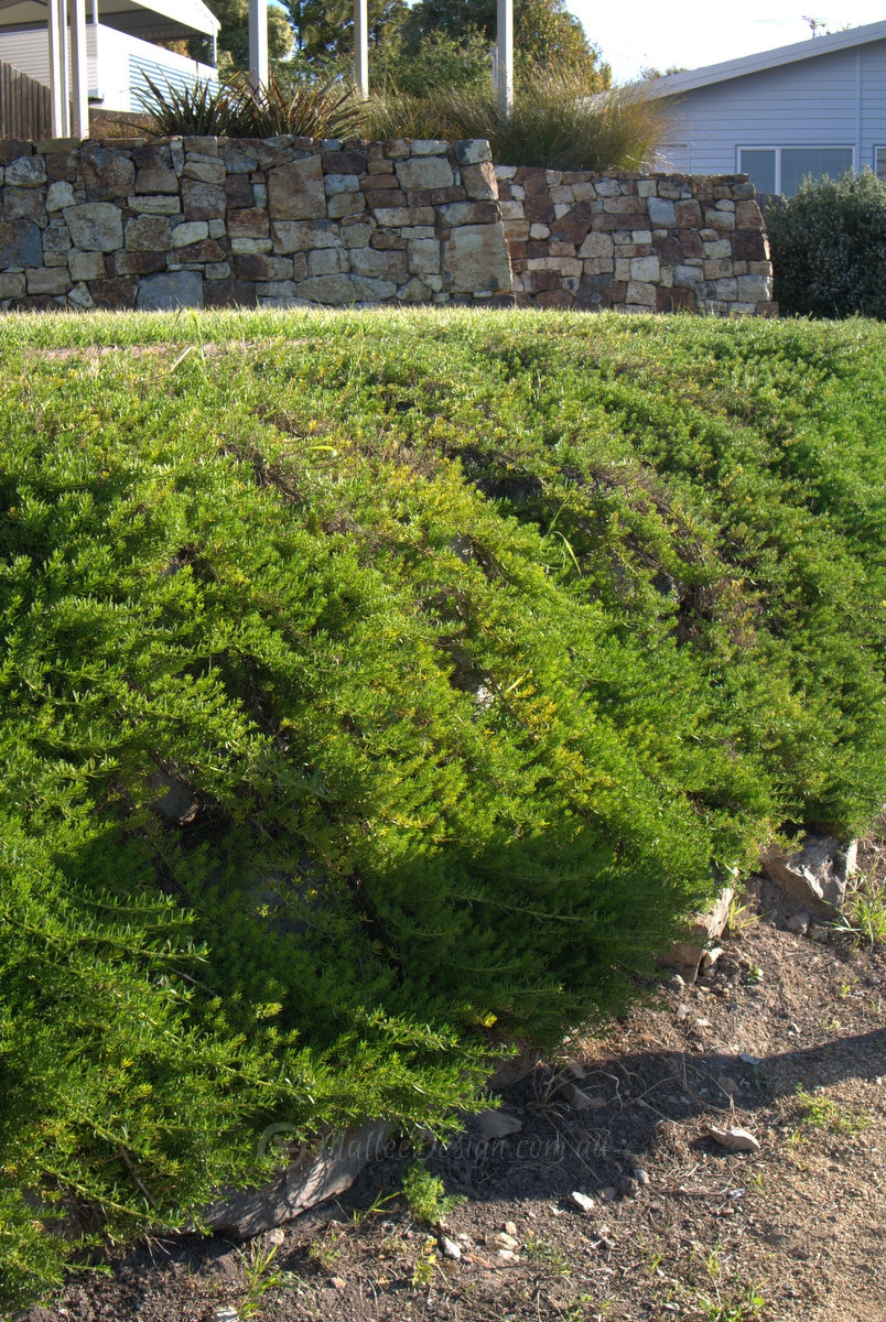 Myopororum parvifolium is seen here as a layered dense ground cover planted on mass that is also a spill over. Here it is also working as a lawn substitute, and would be lovely to play or lay on.