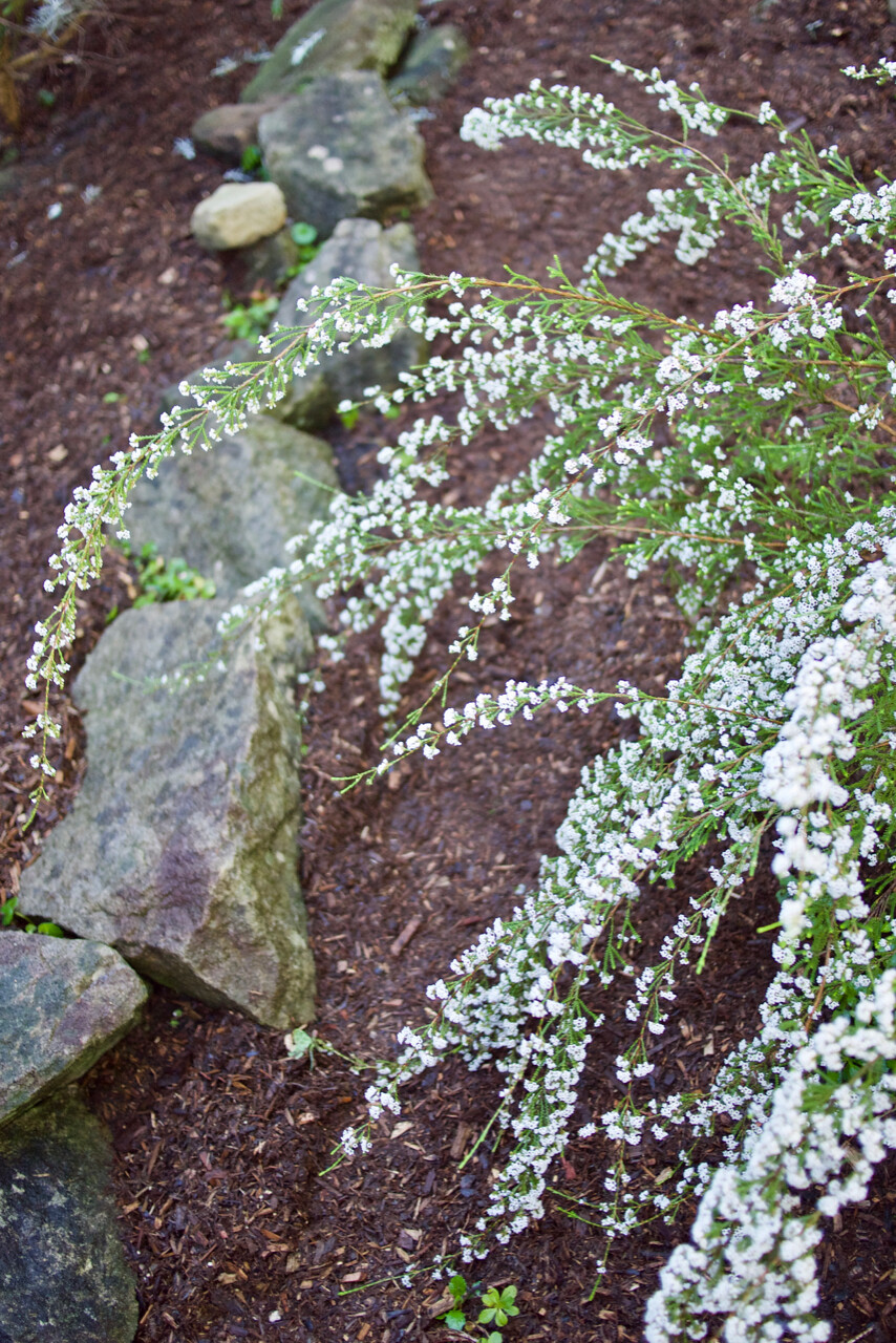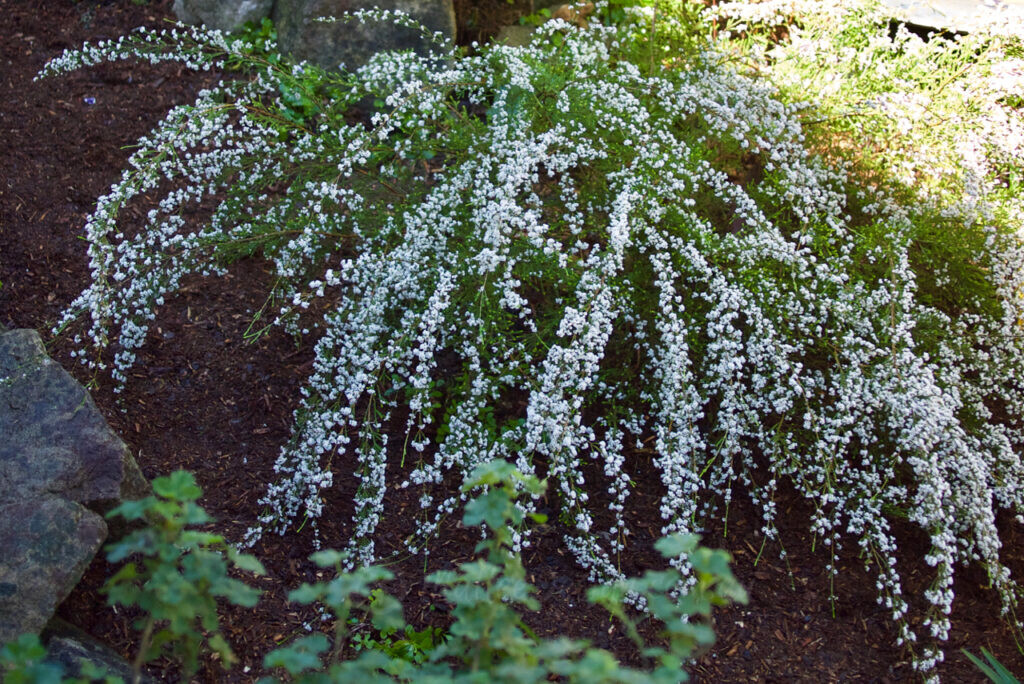 The shrub only reaches half a metre high by upto a metre wide and has a lovely weeping habit created by it long arching branchlets. It can get a little leggy but a simple prune will encourage new growth and stop it looking scraggly.
