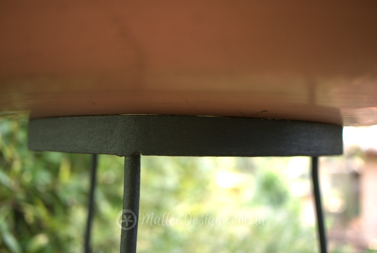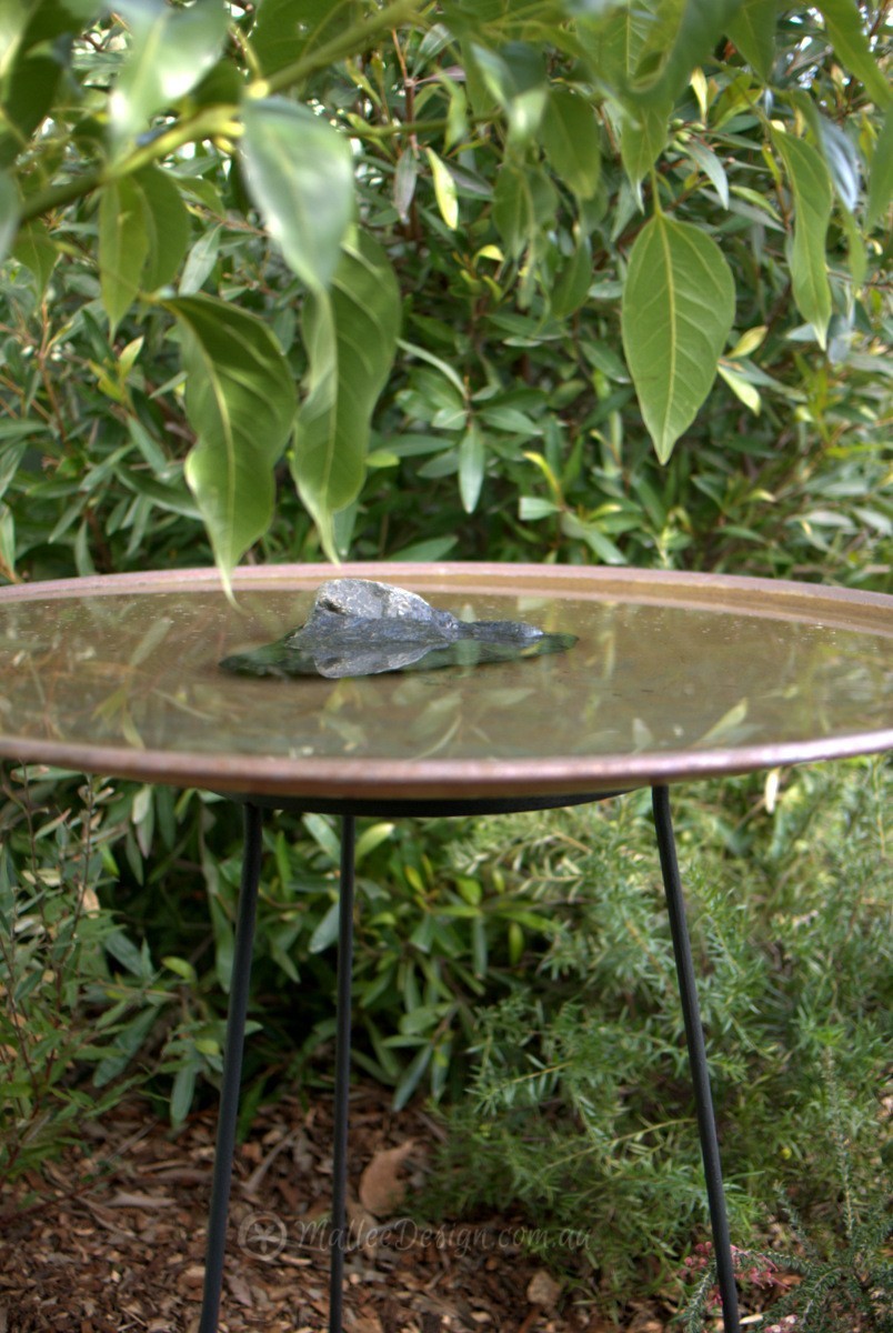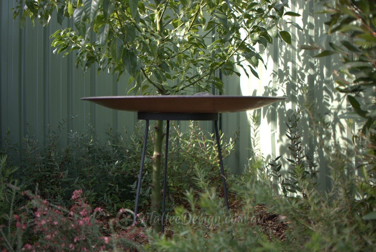 This is the new steel tripod stand for my spun copper dishes, this stand is designed to disappear into the plants in a garden bed. It is made up of three thin metal rods that taper and attach to a steel ring on which the dish sits upon. This bird bath can be purchased over here.
