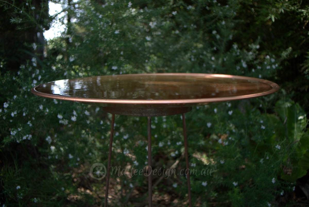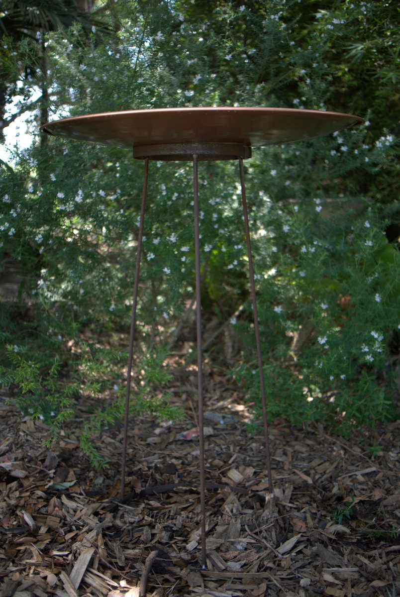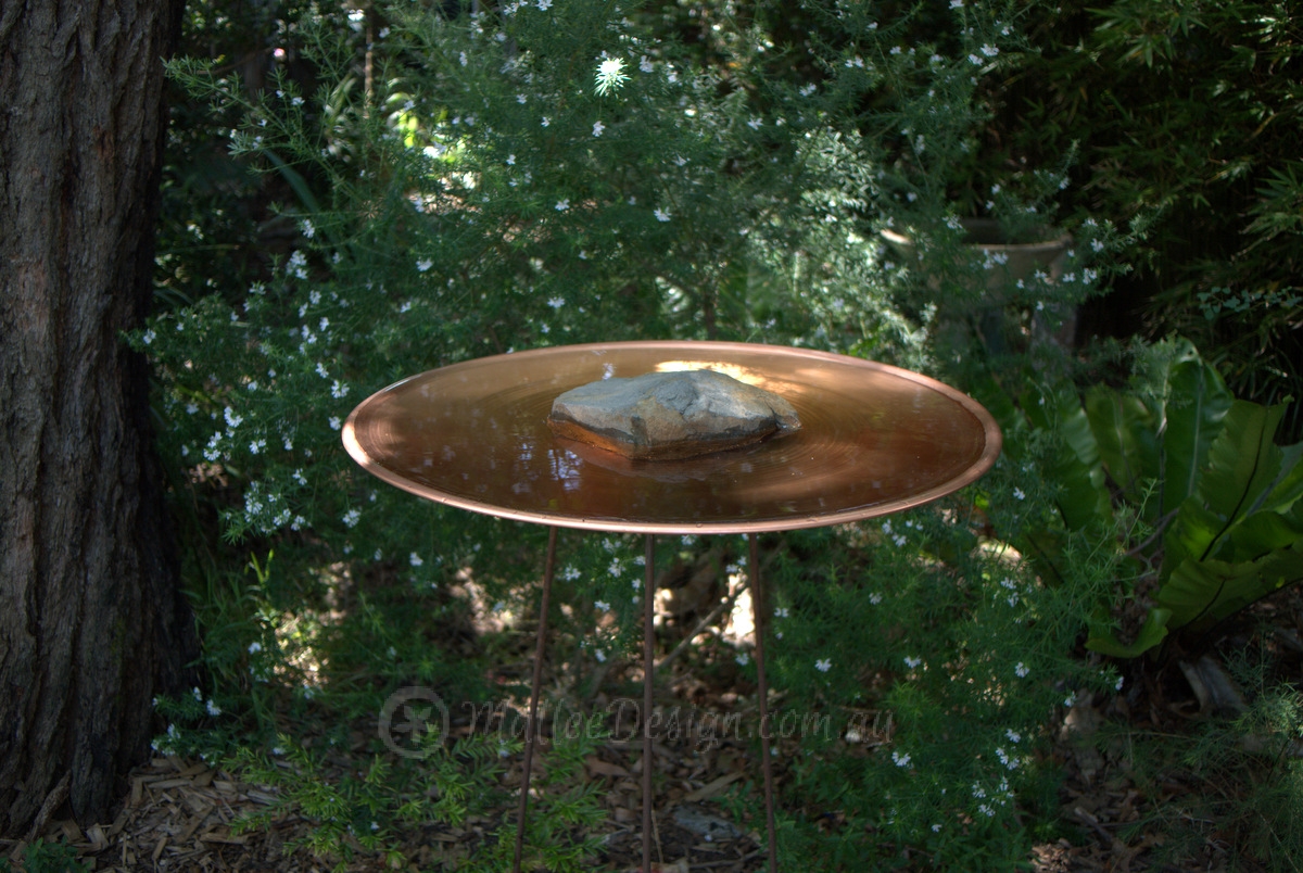 Introducing the ‘Floating’ bird bath, I am so happy with this design, the spun copper dish sits atop a steel tripod made of thin rods and two rings, the base simply disappears into the garden if you want it to. The steel tripod stands at 1 metre high, it is the tallest of all the bases I have made so far, please see the image above with my dog posing for size reference he is a medium sized furry friend 😉