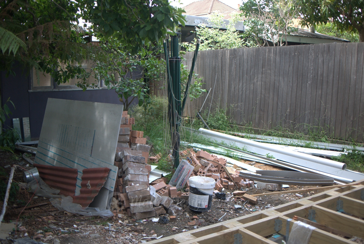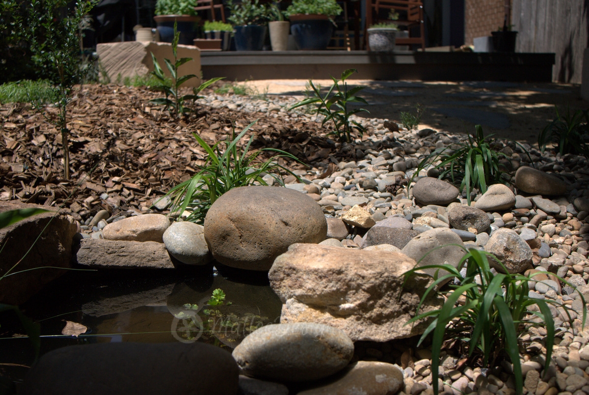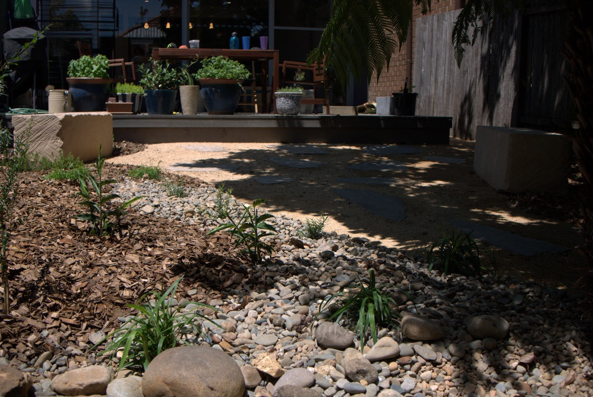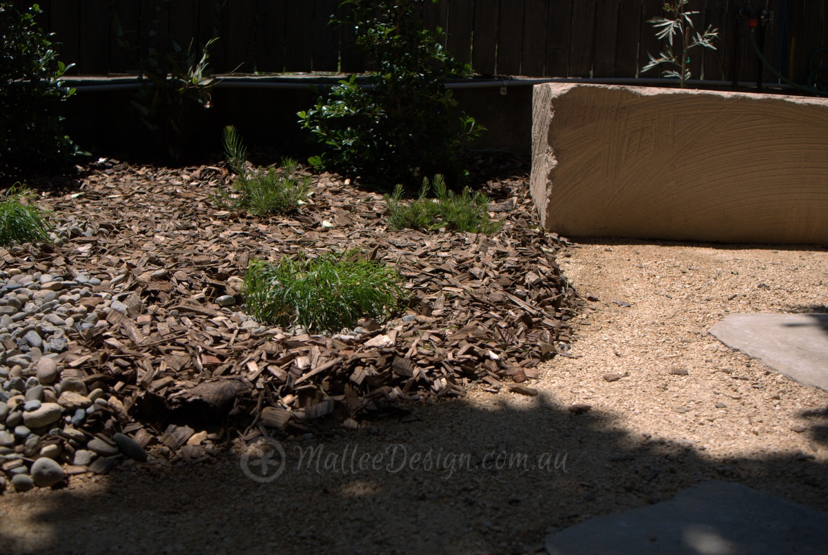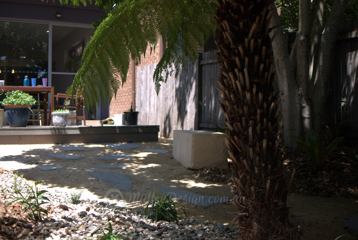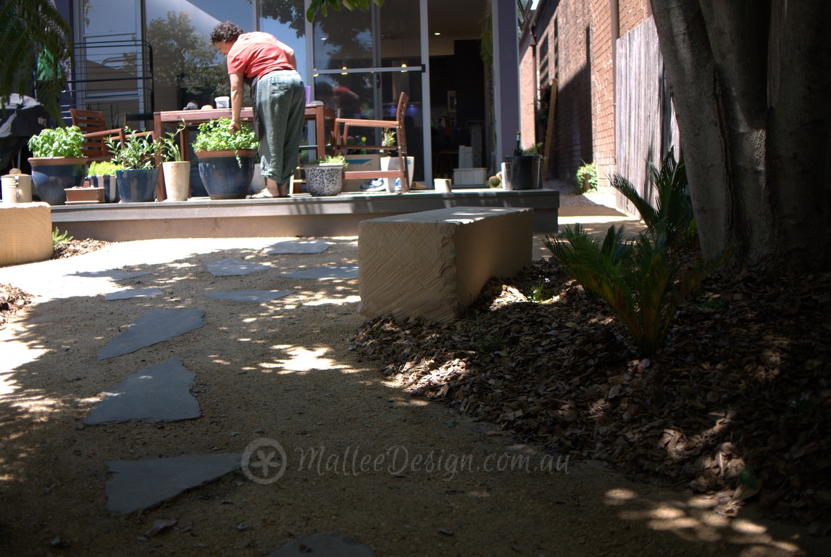 I used crushed decomposed granite Deco Gold as the main surface with re-cycled concrete as the steppers, we also installed two sawn sandstone logs as seats, one under the shade of the Magnolia for Summer contemplation and the other near the deck for winter sun soaking. Seen below in the background.
