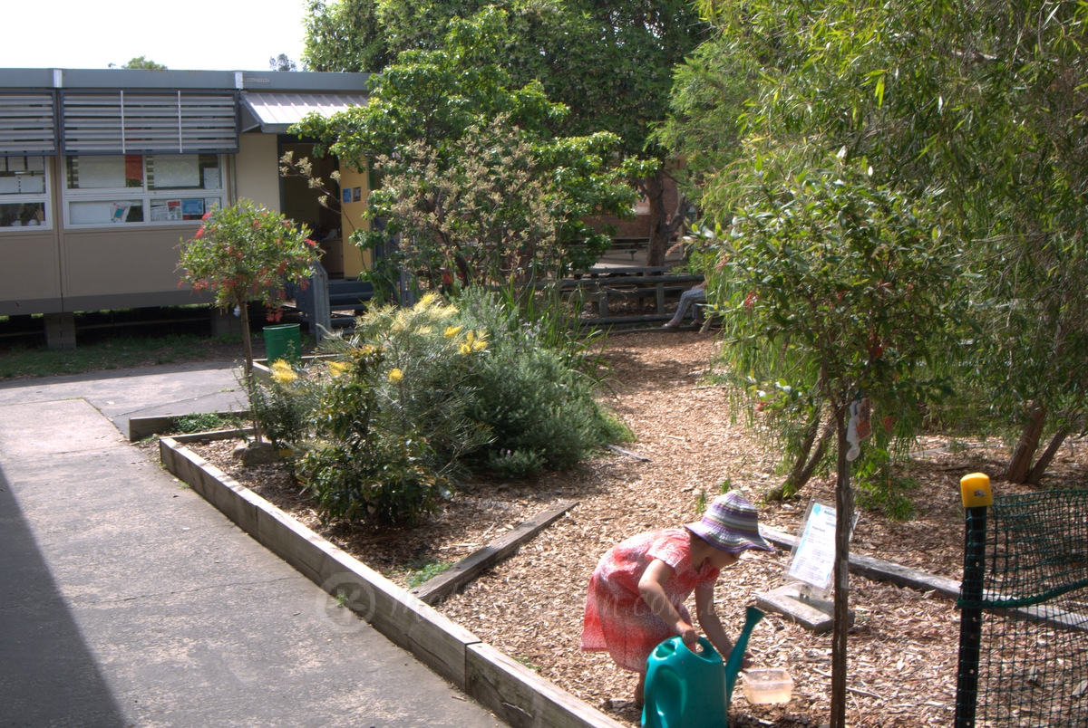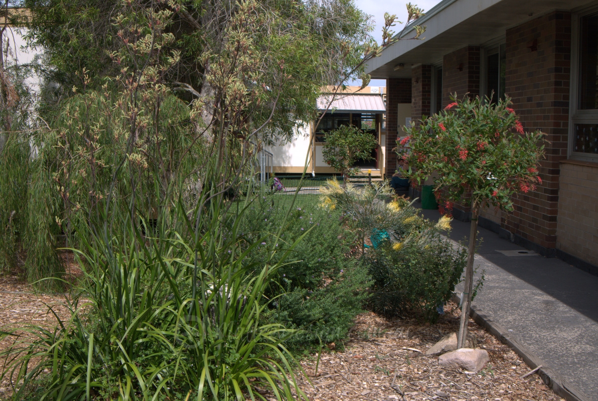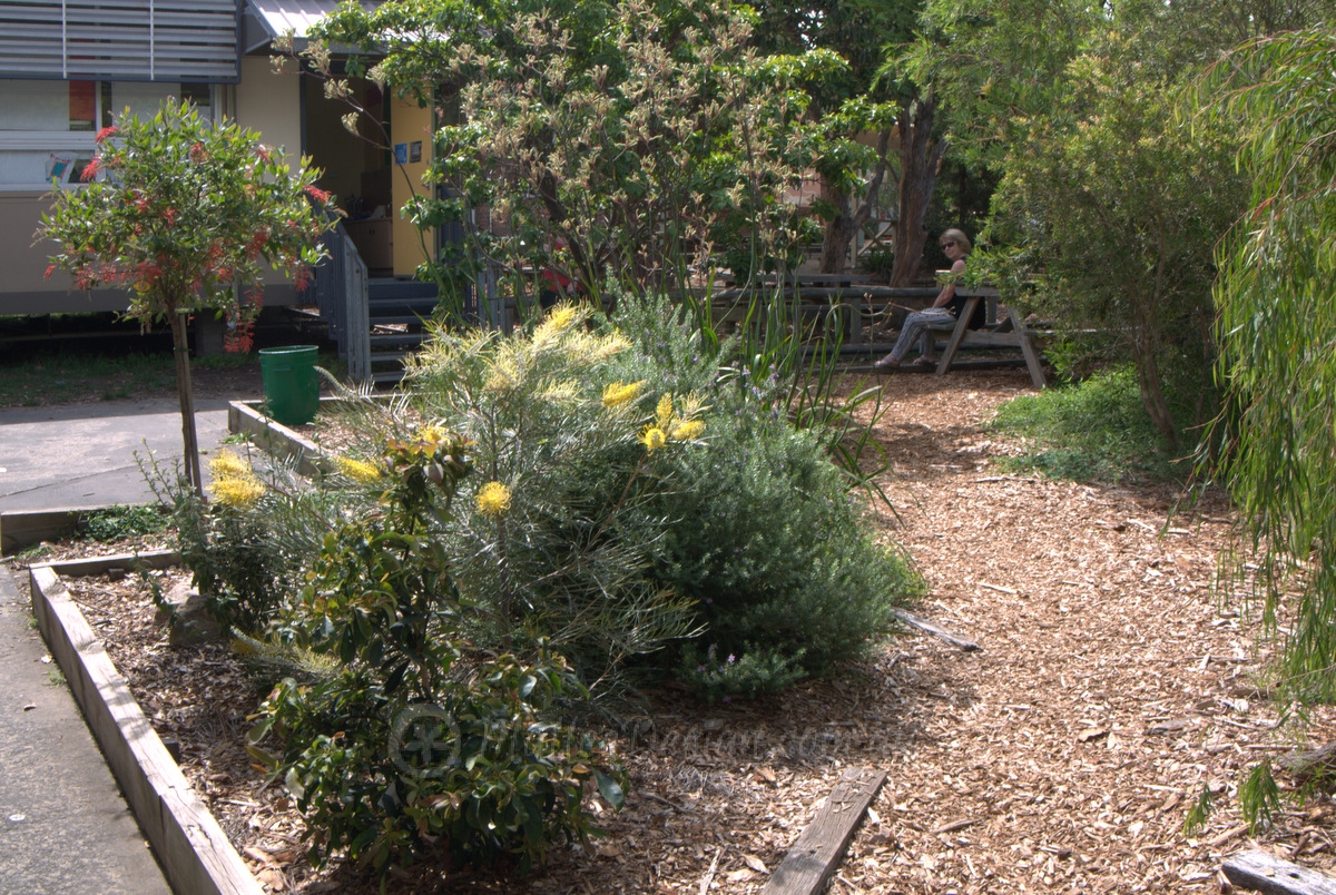 Below you can see the super happy Grevillea ‘Sandra Gordon’ and a dwarf form of Tristaniopsis laurina, not to mention the Westringia ‘Jervis Gem’, which are always good for tough sites. Many of these were trampled on when first planted and they had to fight to survive all those little feet.