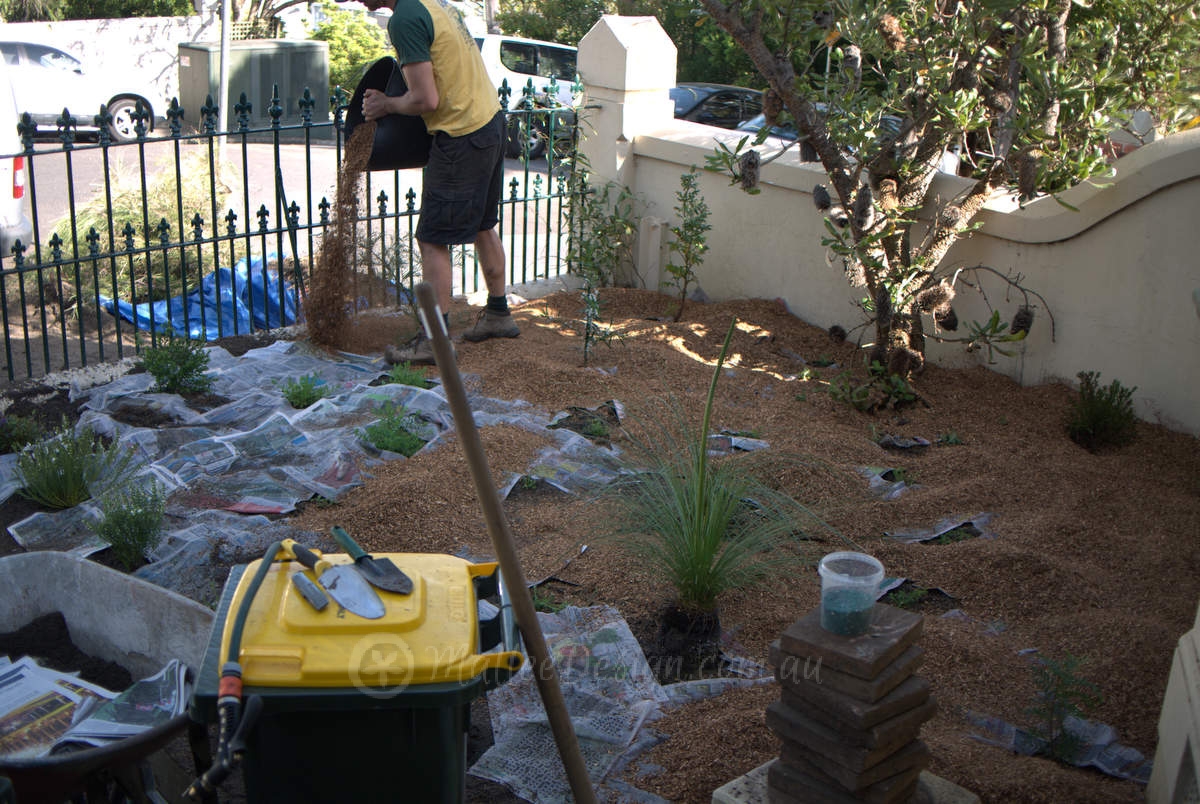 Native top soil was brought in to rejuvenate the garden ready for the new planting and we did a thick organic weed matt layer of newspaper under the mulch. This is a temporary solution that breaks down in about 8 months, giving plants like ground covers and spreading shrubs time to settle in and cover the ground for weed supression.