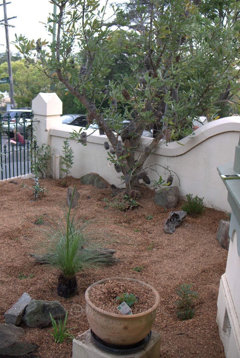 The plants that were retained include this most impressive Banksia serrata which has been underplanted with Flannel Flowers, a small Grass Tree which was given a mate (with a small trunk and flower spike already!) and a Cyathea cooperi. As the direct sun is quite limited I chose pants like Lomatia, Correa, Pimelia and Tetratheca which will all flower in the shade.