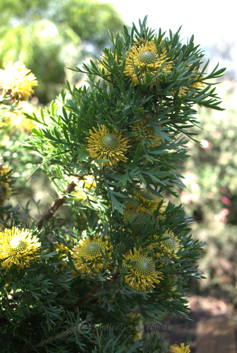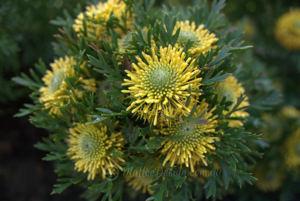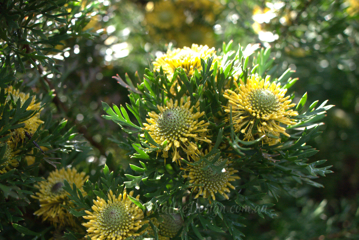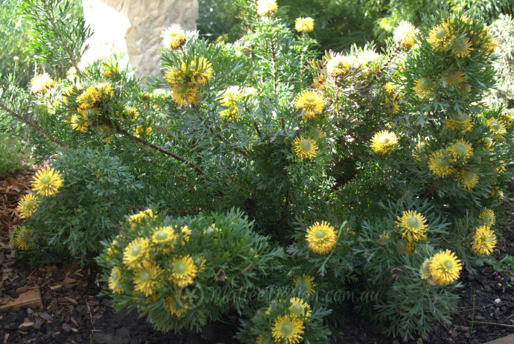 The plant in the image above has been in the ground for about 3 years, they are not a particularly quick growing species however when they begin to flower they make up for their slow growing progress. Isopogon ‘Little Drumsticks’ will retain a dense low growing habit without being pruned, it enjoys a moist well drained soil in full sun to part shade.