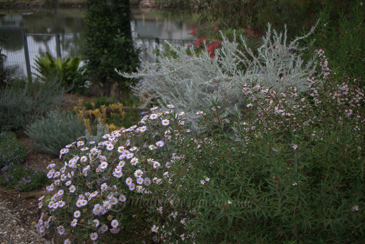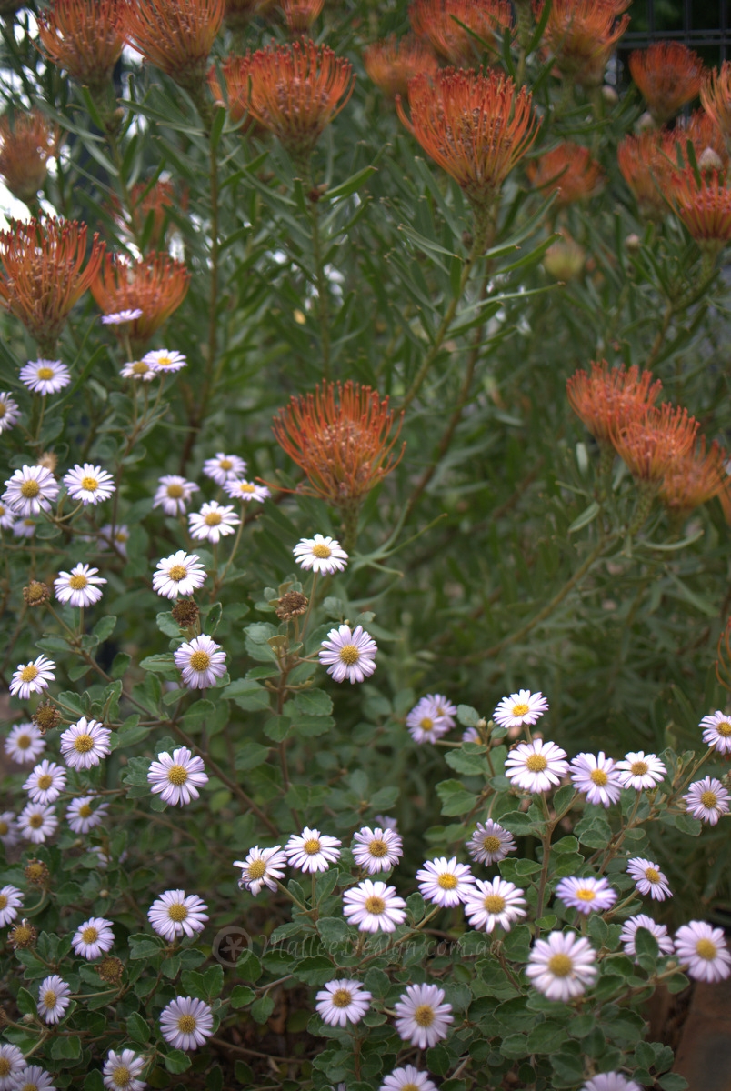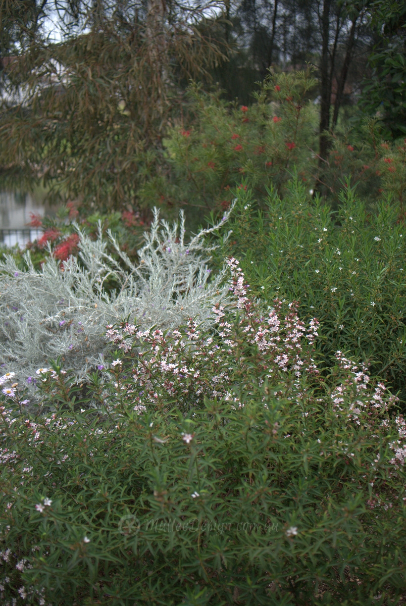 The Philotheca myoporoides has been clipped into a neat thick shrubs and sets off the Eremophila ‘Nivea’ beautifully.