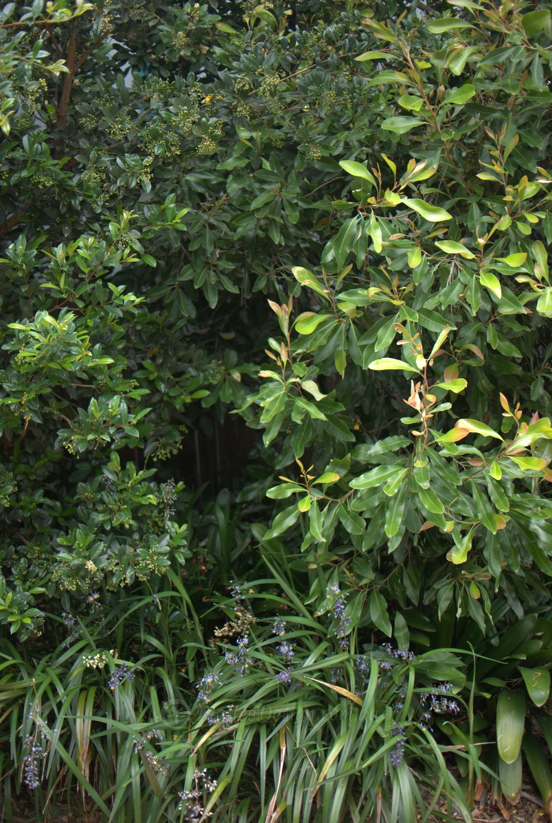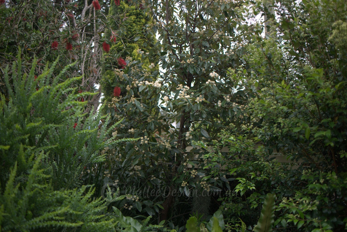 The front garden has been enclosed with dense screening plants so that it is private from the street. In the image above you can see (from left to right) Acacia ‘Little Nugget’, Callistemon ‘Endevour’, Callicoma serratifolia in full flower and Backhousia myrtifolia. All wonderful screening plants.