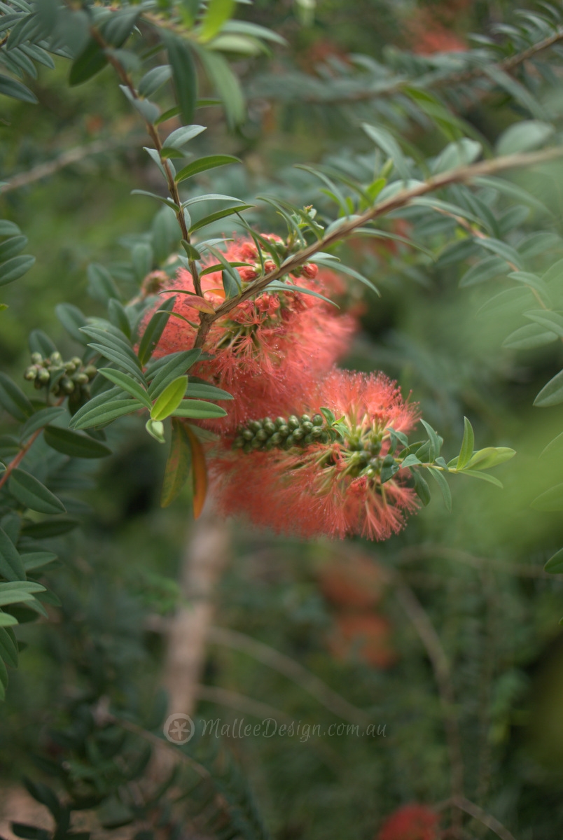 In the image above on the left you can see Melaleuca hypericifolia, however it doesn’t look like its regular sprawling messy self, it has been pruned to be an upright weeping shrub with the lower branches pruned to show off the pretty bark. By maintaining it this way you also have a much better view of the flowers and apparently the birds flock to this species.
