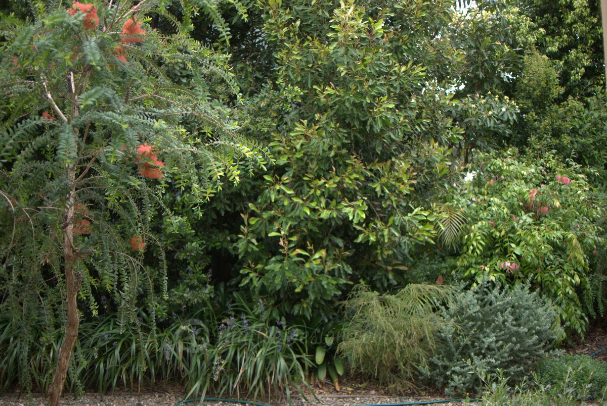 Dianella caerulea has been planted as an under storey border to the tall hedging trees of Buckinghamia celsissima, Planchonella australis and Syzygium sp.