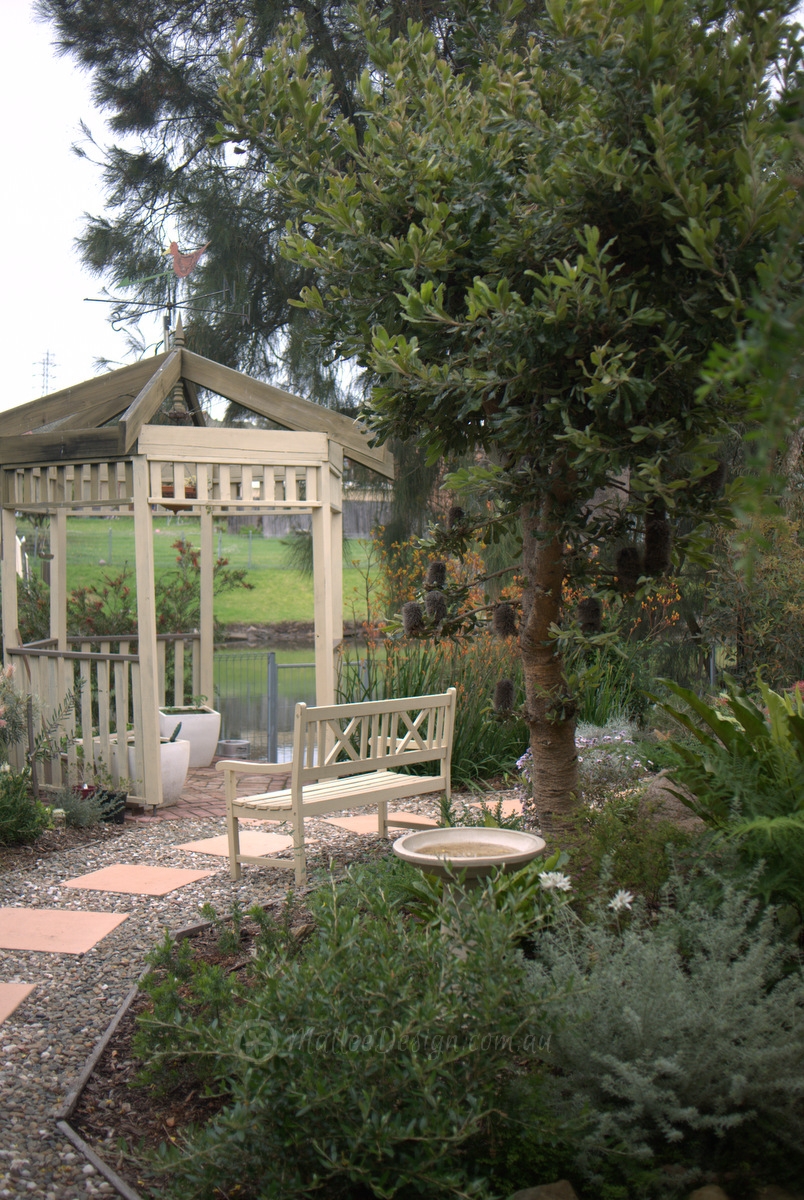 The rear garden backs onto the water, it is a wetland that feeds into a large lake, the owner takes her kayak out the back gate and then explores the waterway by launching off her back fence! There is plenty of great examples of contrasting planting in the rear garden. Plants have been chosen for their foliage contrast and striking forms. The Banksia serrata in the image above makes a great small feature tree with its lower branches pruned.