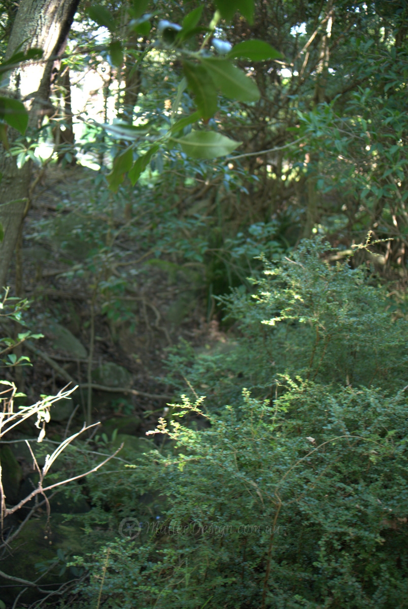 I am not sure if  ‘Site specific local indigenous species’ (probably not) is even an appropriate term, however it is the only way I can convey how extremely appropriate the plants we are using in this design will be. The garden is very shady and backs onto bushland at the rear (see photo below), the creek runs down the side of the house and then across the front of the property. There are plenty of existing sandstone boulders in place that need to be uncovered, and the front garden has a native bird food forest already established.
