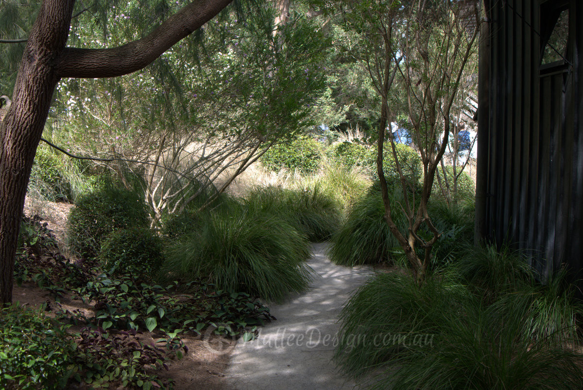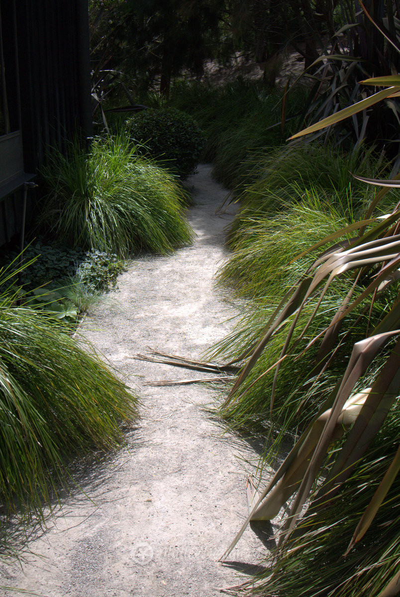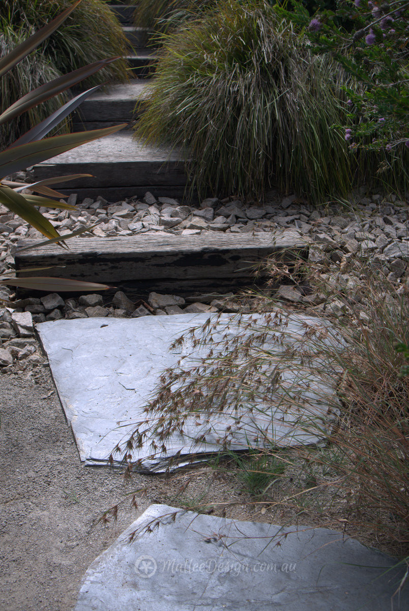 The gravel pathway is offset with varying steppers made from slate, timber and stone, in the foreground you can see Themeda australis in full seed, so pretty!