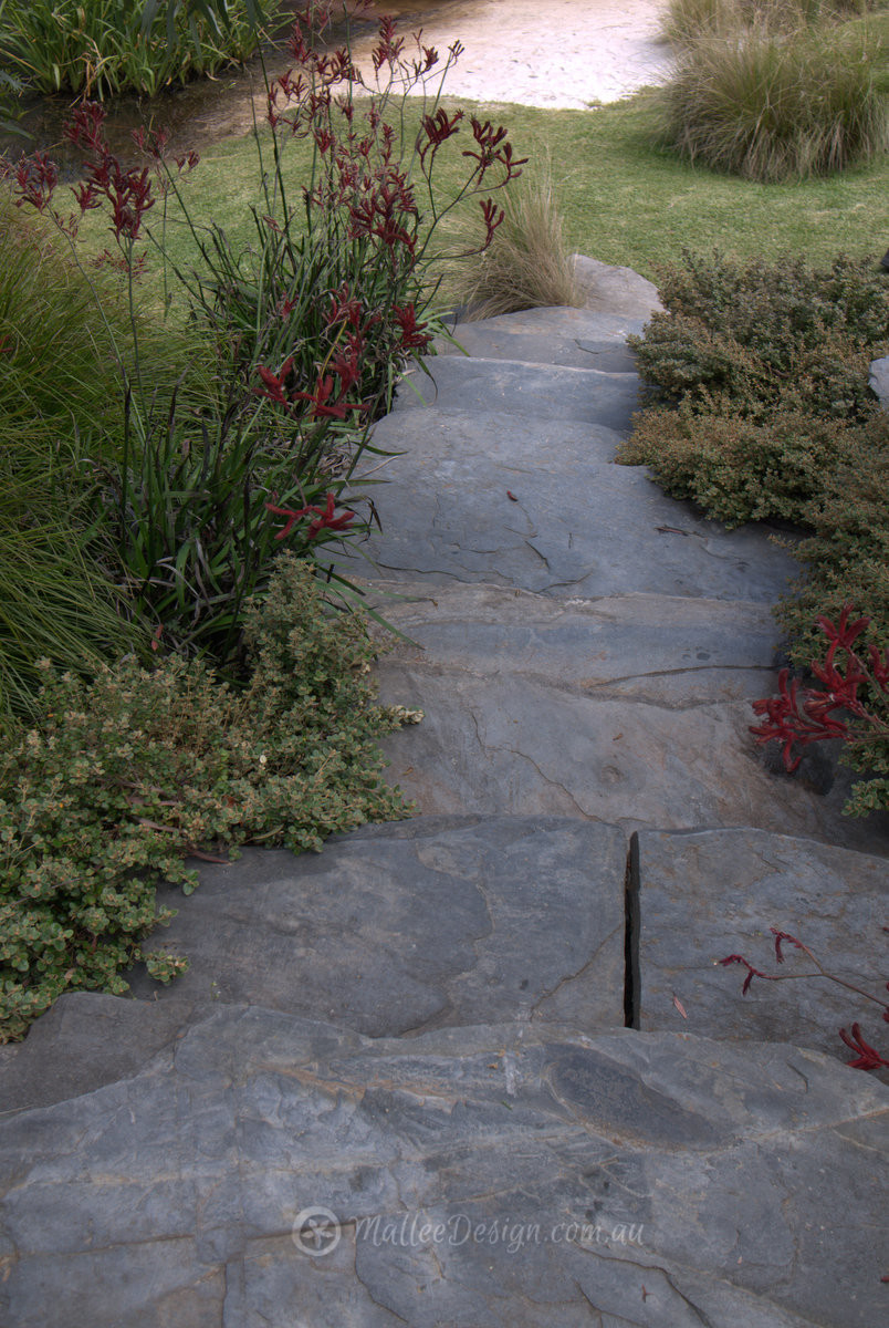 These are the stone steps leading down to the waters edge, I love the Anigozanthos ‘Big Red’ and Correa reflexa var. nummularia hugging the edges.