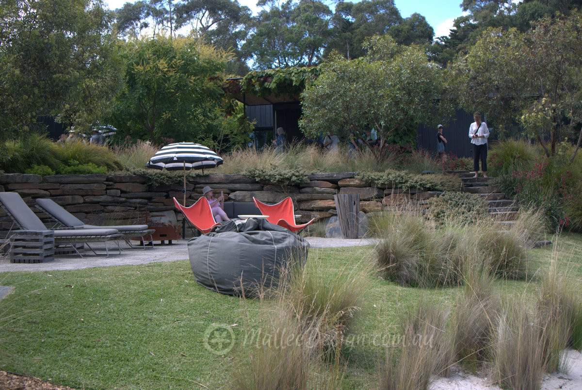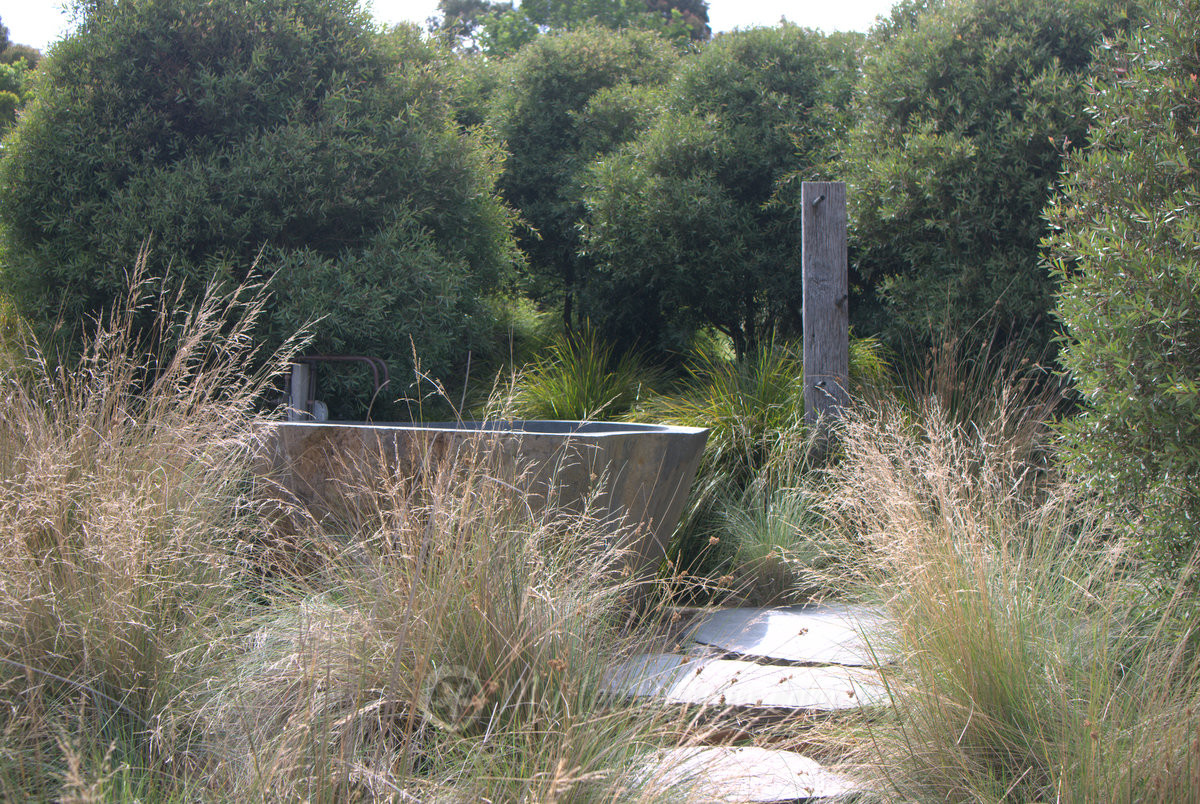 This large rural garden was stunning, it was positioned around a central lake with a small gravel beach and jetty. It also had the most wonderful outdoor bath I have ever seen. Melaleuca quinquenervia was used as a privacy screen for the bath and shower area, in the foreground you can see a mass planting of Poa labillardieri with Lomandra ‘Tanika’ in the background.