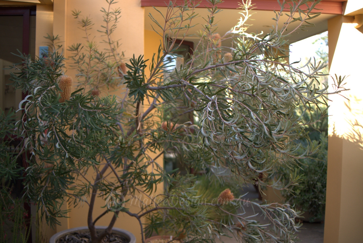 Another reason is to grow species that might otherwise become too large if planted in the ground, many native plants will quite happily grow with a restricted root zone in a container and they may even thrive, like the WA Banksia species above.