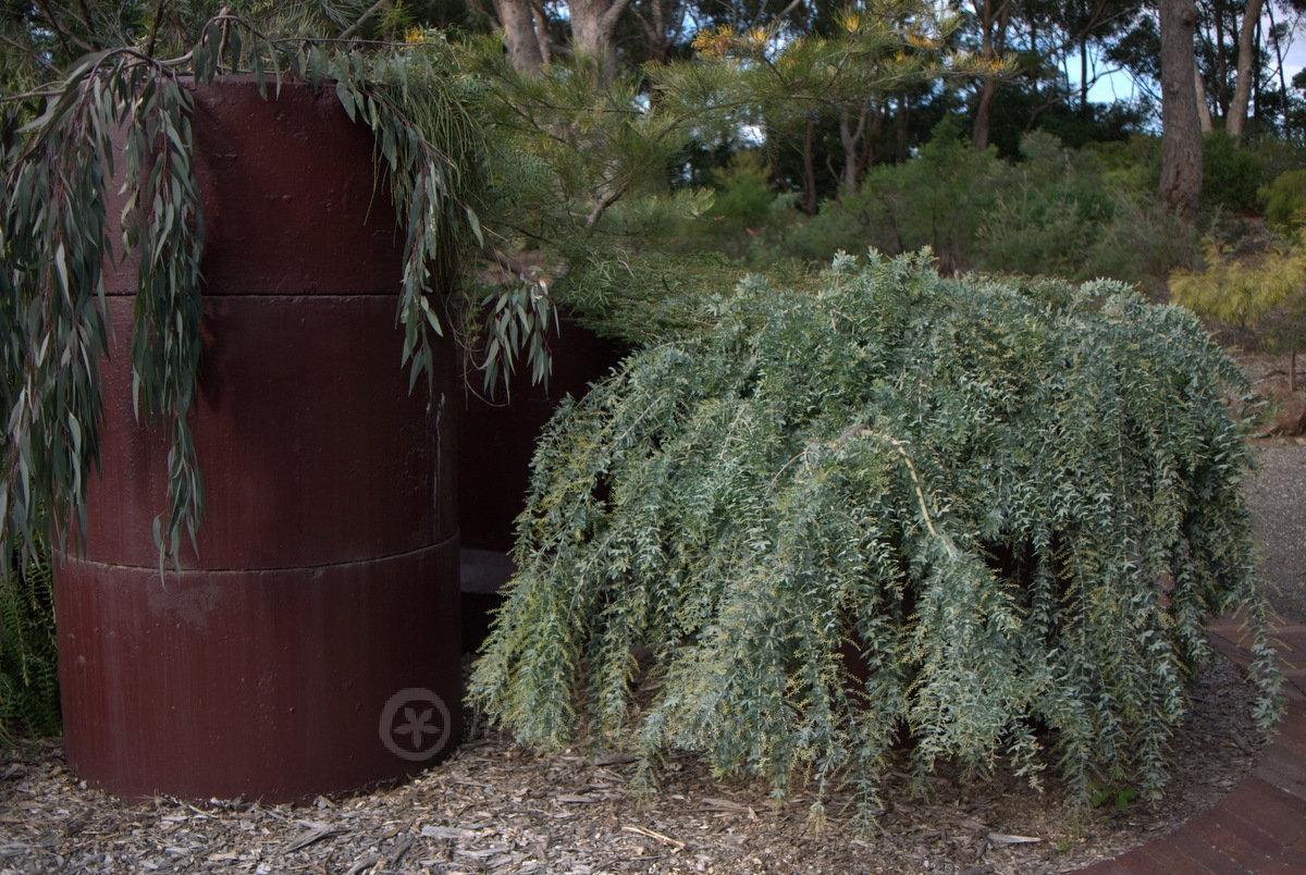 I am a big fan of soft foliage and sometimes it is good to try and get some height in a pot also, this is why any grafted standard in a pot really works, like the Acacia ‘Limelight’ standards seen in the first image. Below is Acacia ‘Waterfall’ as a low grafted standard, its soft weeping foliage will continue to spill over and almost cover this tall pot.P1160151