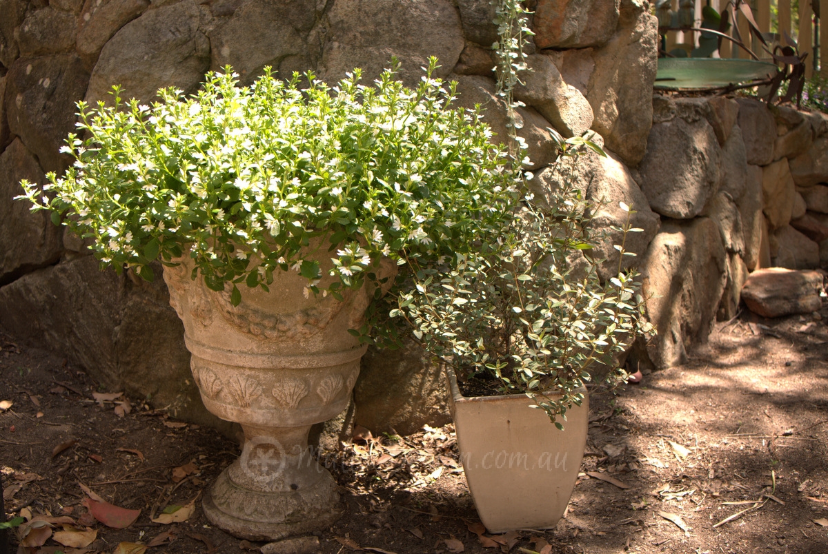 It the image above you can see Eucualyptus ‘Blue Veil’ and Acacia baileyana prostrate, growing very happily cascading out of their containers. Often ground cover plants like these will need to be trimmed regularly if grown in a pot.