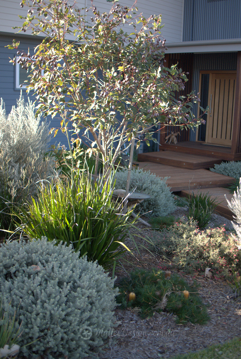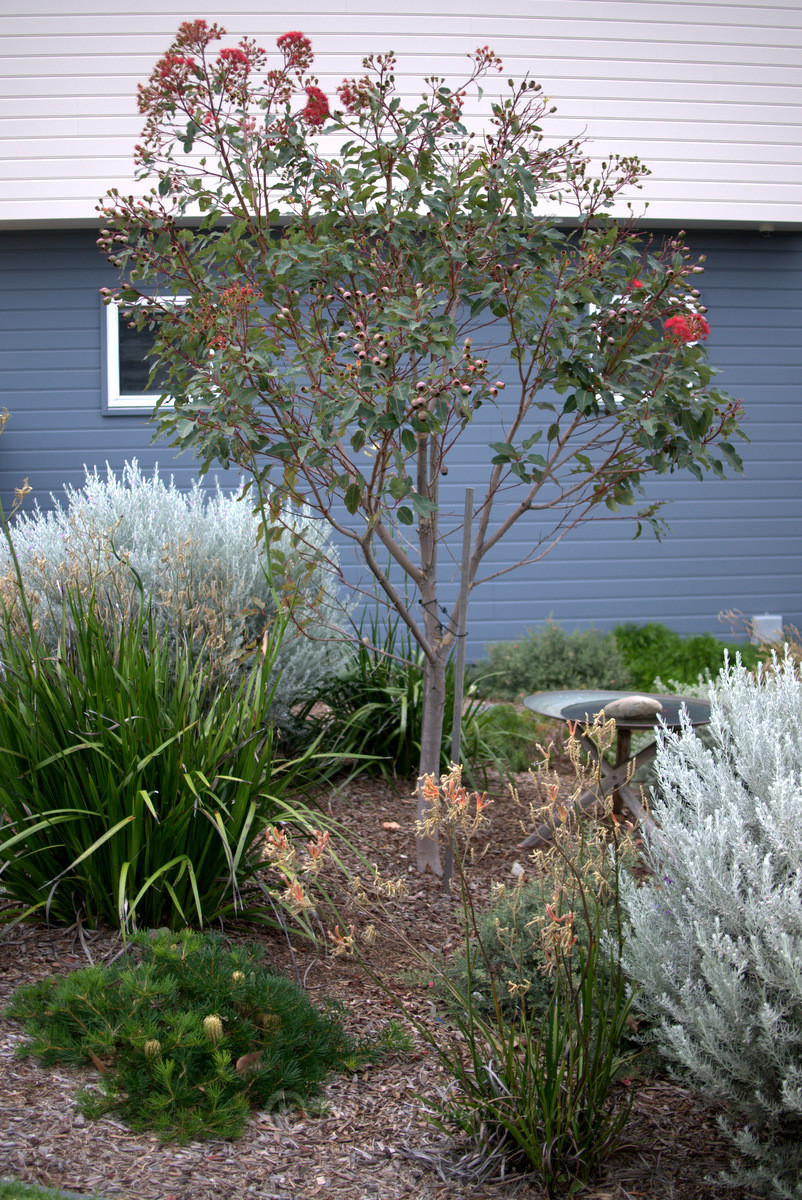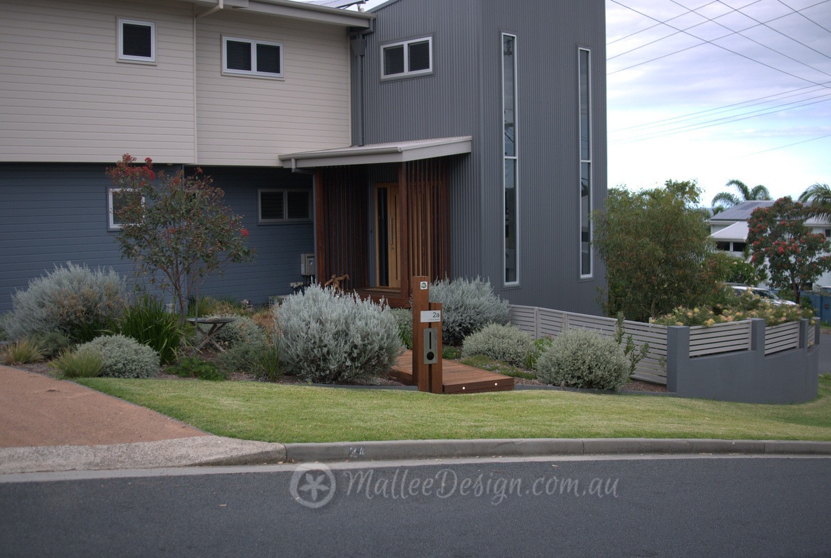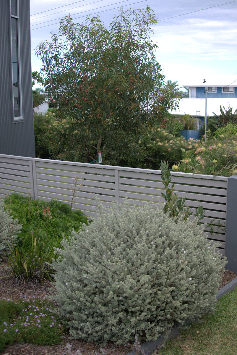 One of the most important plants in this front garden is a Eucalyptus ‘Euky Dwarf’, it has been planted in a prime position to partially shield the two storey house from the corner aspect. But also to help protect the building from the hot Western Summer Sun and it is beginning to do its job, you can see it in the image below behind the fence.