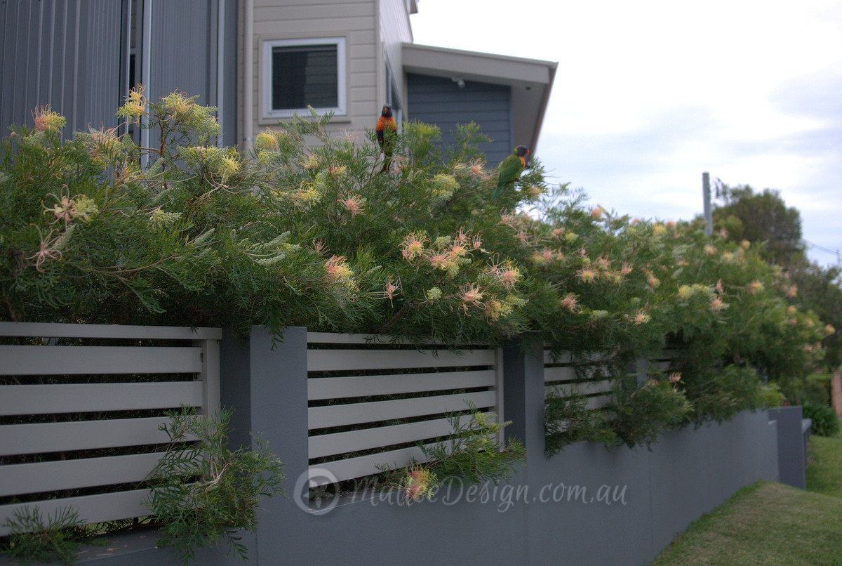Another star performer in this garden is the Grevillea ‘Peaches and Cream’ hedge, which hasn’t missed a beat, it has flowered continuously even though in part shade and high wind.