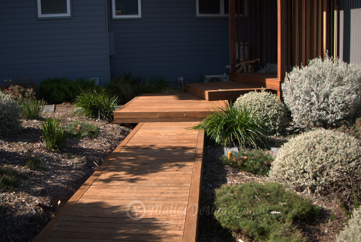 This garden gets very little direct sun and has a simple planting with an under-storey of Rhagodia spinescens and Ficinia nodosa and one Banksia ‘Sentinel’ to provide a little privacy to shower behind.