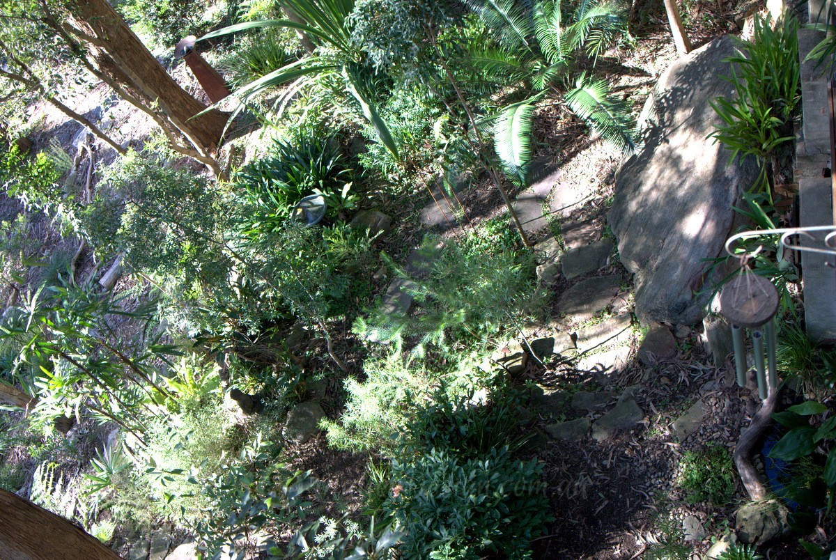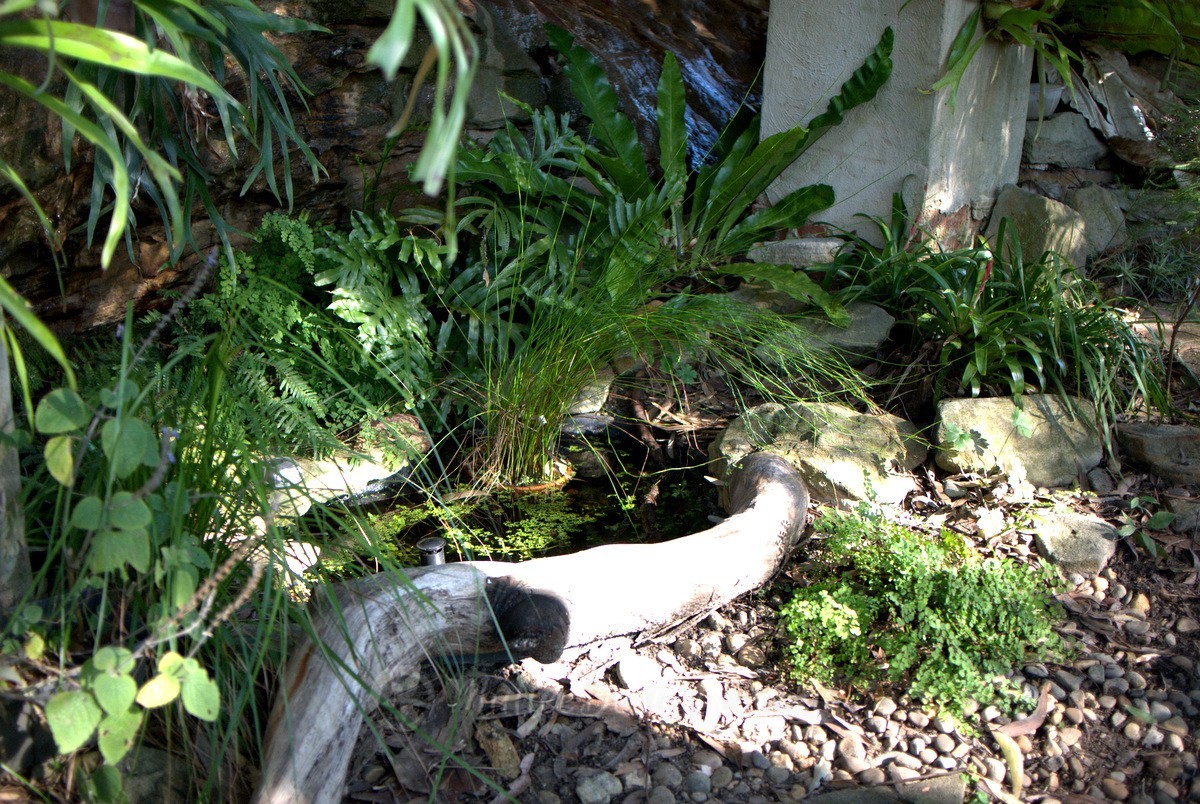 A small pond has been built in a dead space under the house, where large sandstone outcrops and brick piers create a small sheltered micro-climate.