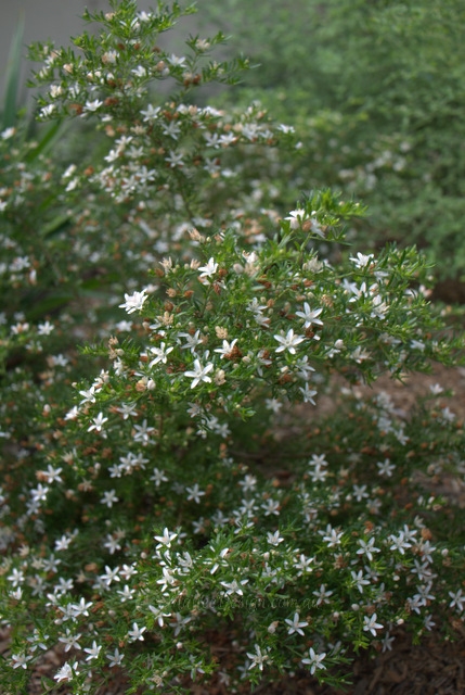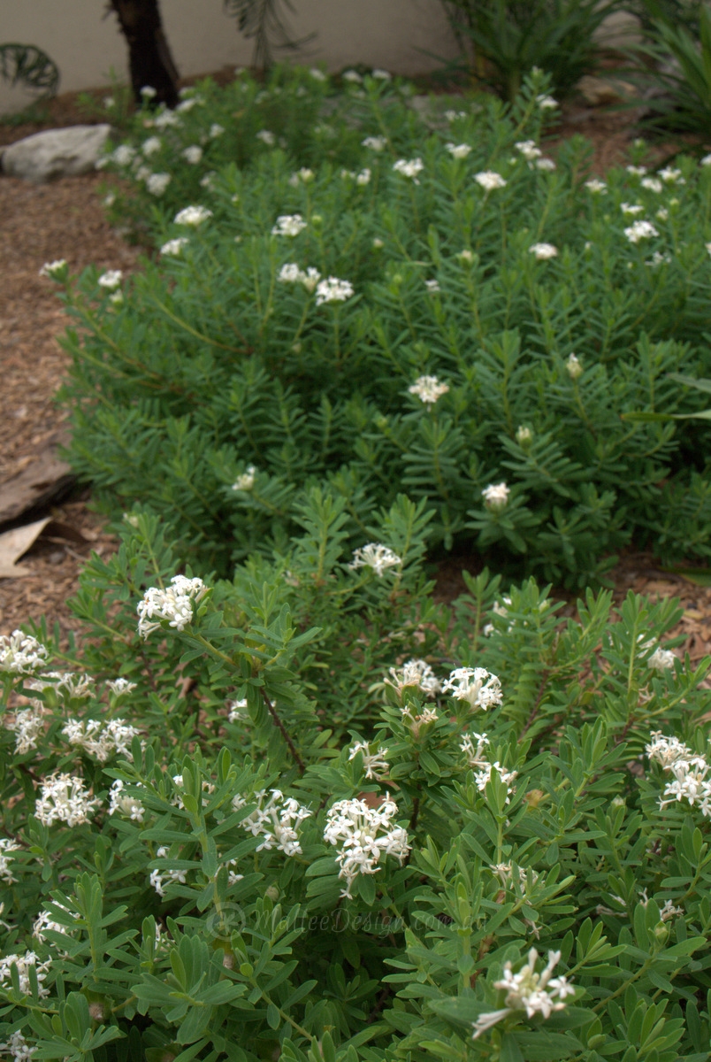In the above image you can see the lush green foliage of Pimelea ‘White Jewel’ this plant is another feature in this garden, it has flowered for almost 6 months straight through spring/summer and now is resting. Below is a shot of it in all its glory.