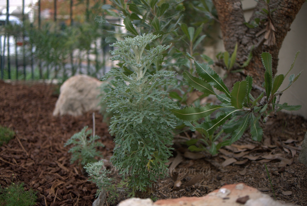 This little pocket under the existing Banksia serrata is a good example, it is morning to mid-day sun with afternoon shade and because the Banksia is quite large the soil is dry here, the perfect spot for growing Flannel Flowers (Actinotus helianthi).