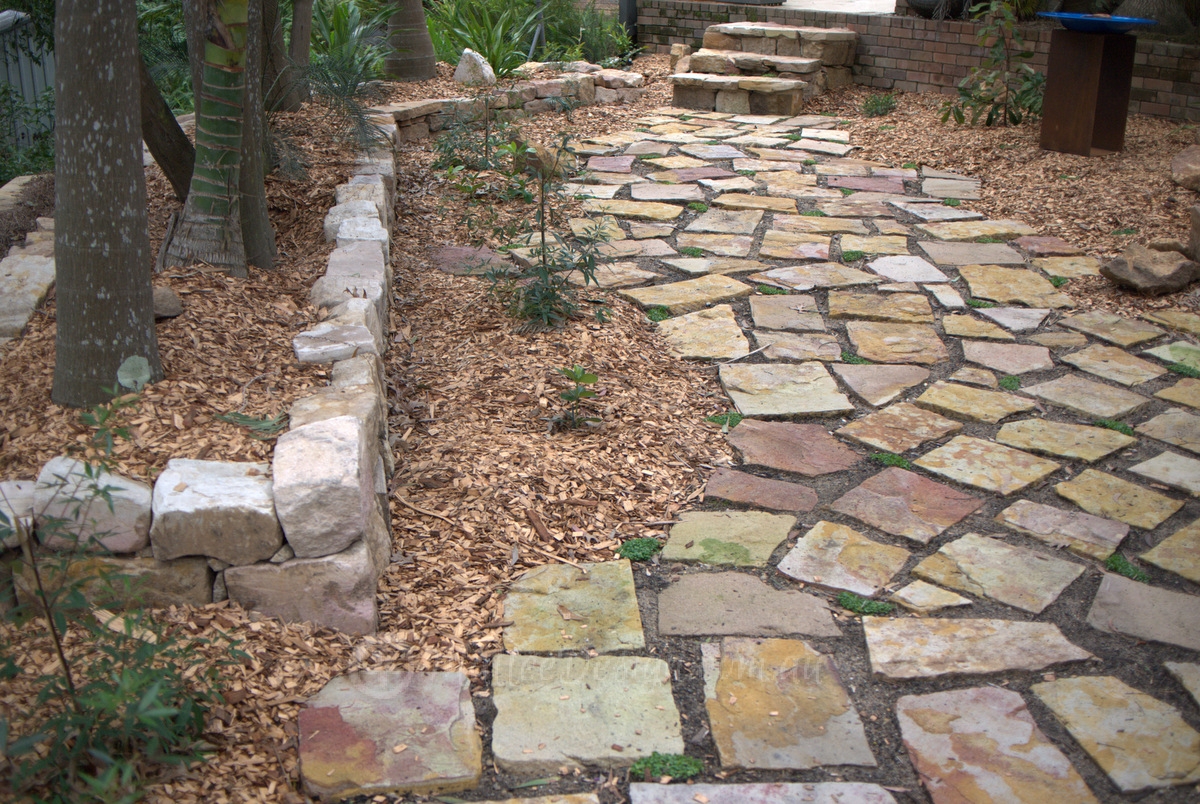 The lawn area was highly compacted and because of the shade not performing at all well, I have replaced it with sandstone flagging and Dichondra repens, which will form a tough mat under foot.