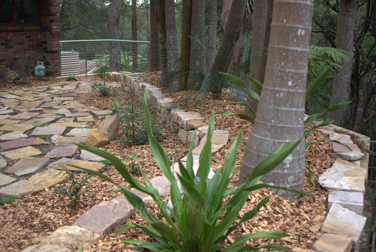 The treated pine log retaining wall for the palms raised bed was removed and replaced with a sandstone block wall, the lower branches of the palms were removed to make space for an understory planting of Doryanthes excelsa and Macrozamia communis. The garden bed in front of the retaining wall is full of Rhododendron lochiae and Ceratopetalum ‘Johannas Christmas’.