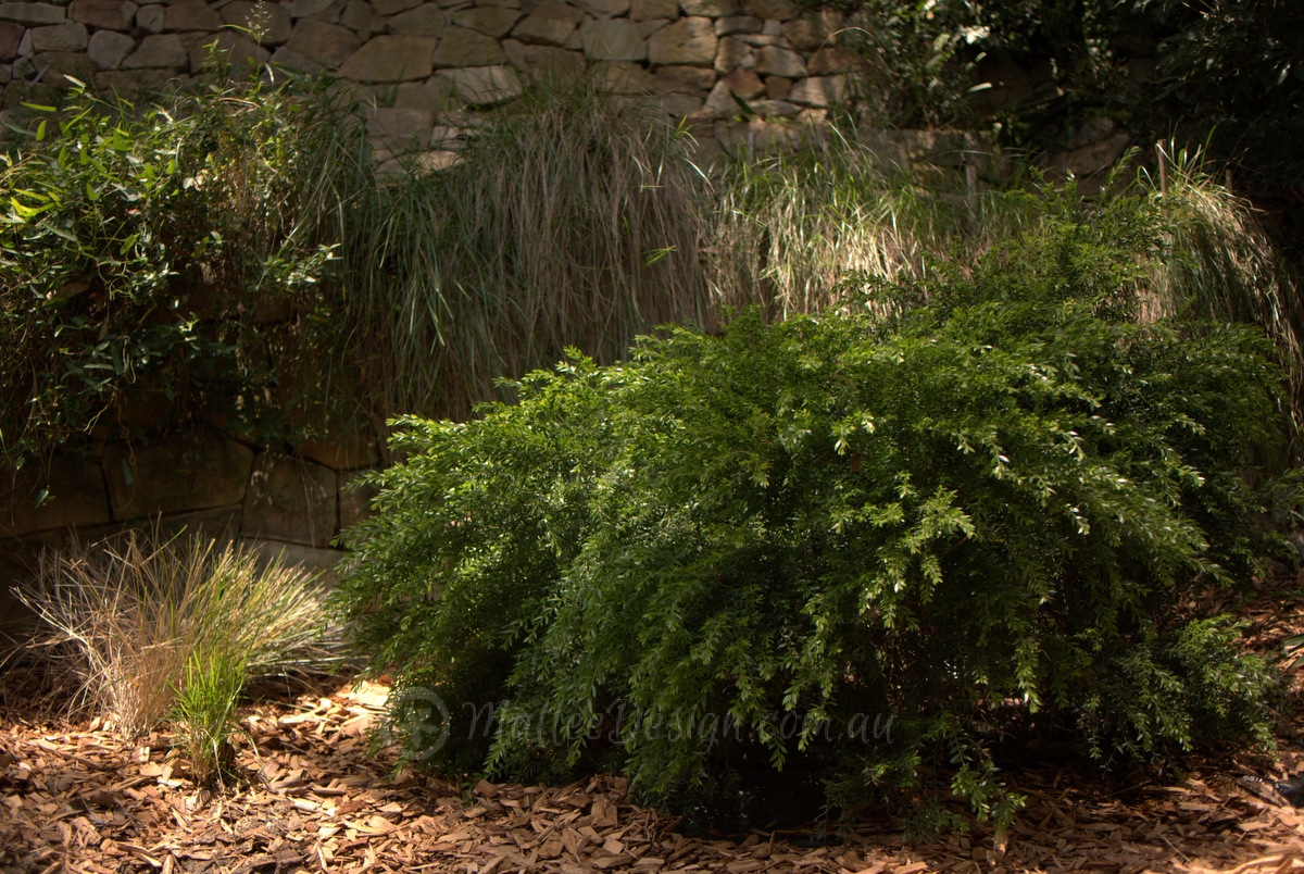 The lowest retaining wall which is viewed from the kitchen and living below will have spill over of Grevillea obtusifolia (above), Acacia baileyana prostrate and Banksia ‘Roller Coaster’.