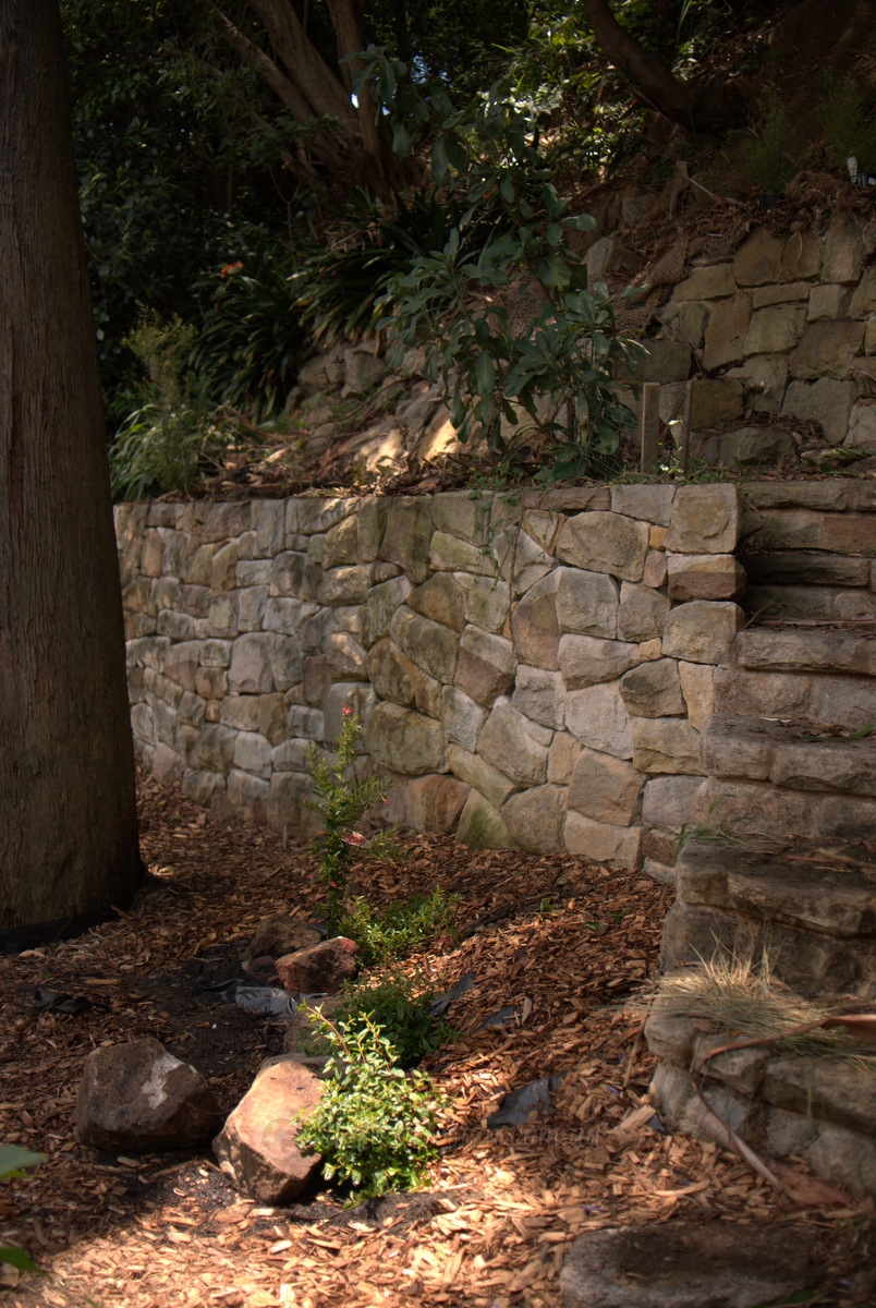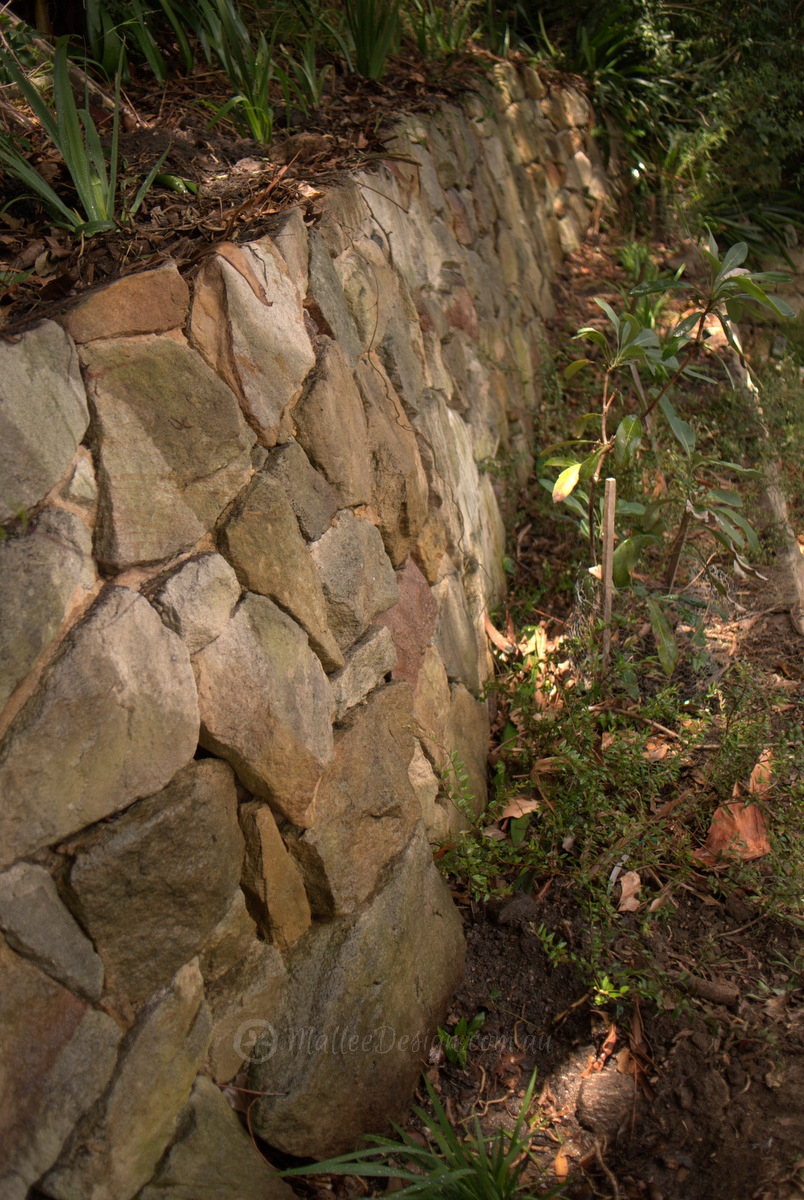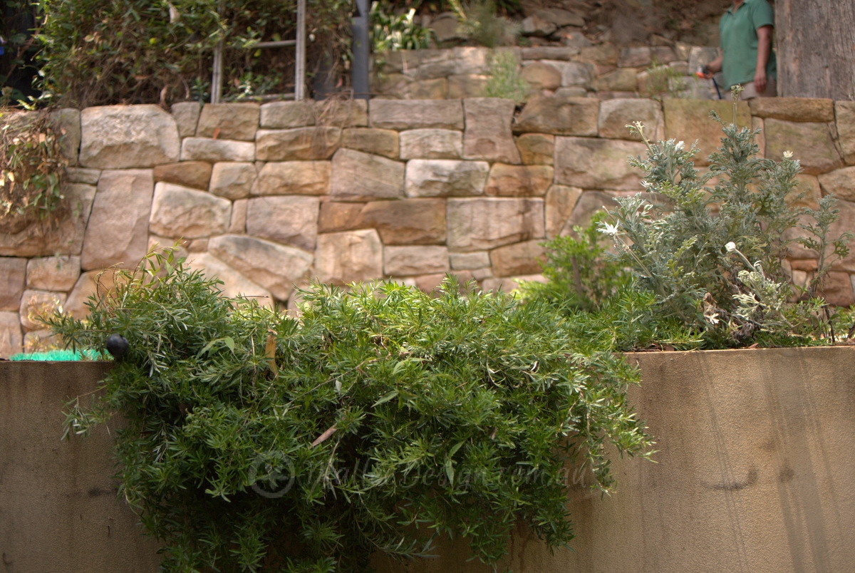 The sandstone retaining walls are flawless,created by someone with a lot of talent and eye for detail, the aim of the garden design was to suppress weeds, add colour, entice wildlife and soften the retaining walls. Above you can see Telopea ‘Shady Lady Red’, Grevillea ‘Lady O’ and Correa ‘Dusky Bells’ in the fore ground.