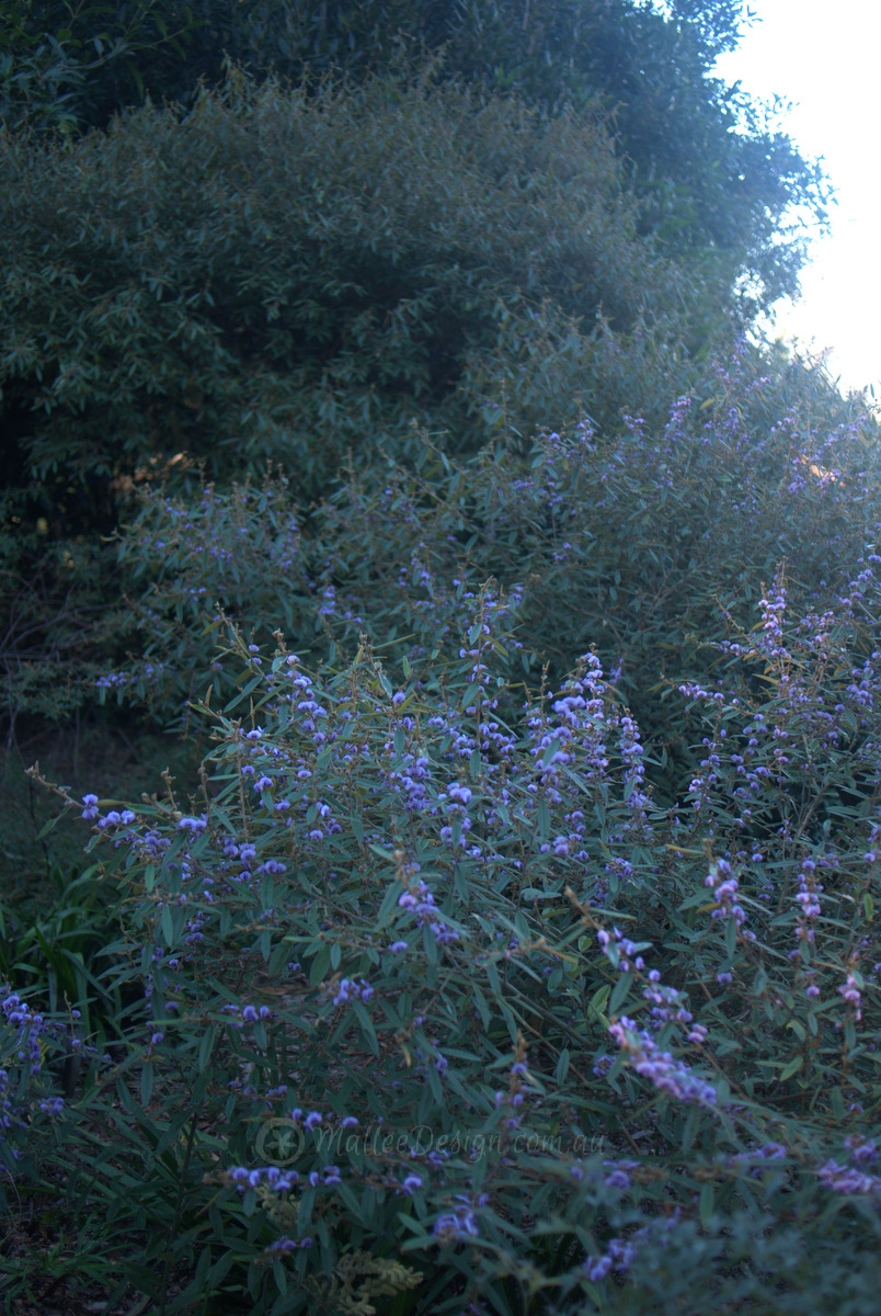 In the image below you can see three layers of planting all pruned to different heights and probably different ages. These specimens were at the Illawarra Grevillea Park, and I would hazard a guess that they have been planted to provide a successional show, as Hovea acutifolia is a short lived plant at between 5 and 7 years. The effect here is going to ensure that there will be Hovea flowering all winter long in this garden bed.