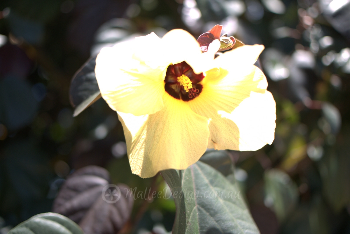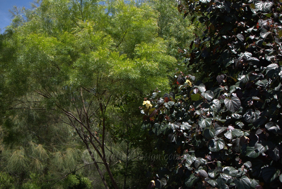 The tree on the left is Acacia fimbriata and the tree on the right is Hibiscus tiliaceus rubra, the Acacia has the soft lime green leaves that which glow in the sun and the hibiscus leaves are almost round and a deep claret red. They would make an excellent tall screen planting or as used here a feature planting when put together, both can be shaped to have a traditional ‘tree’ habit with a canopy and trunk or if left alone will have lower branches that sometime reach the ground.