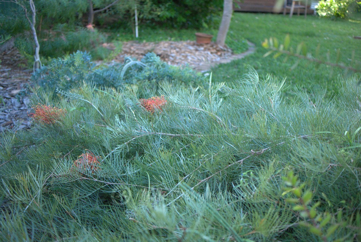 In the image above you can see it mingling with Hakea ‘Burrendong Beauty’, I say mingling but really they are battling it out for space, both inclined to spread. Grevillea ‘Amber Blaze’ can get to 2.5 metres wide and unto 1 metre high. I have never seen it get that high though, I prune off any unruly branches but they seem to maintain a nice dense low habit.