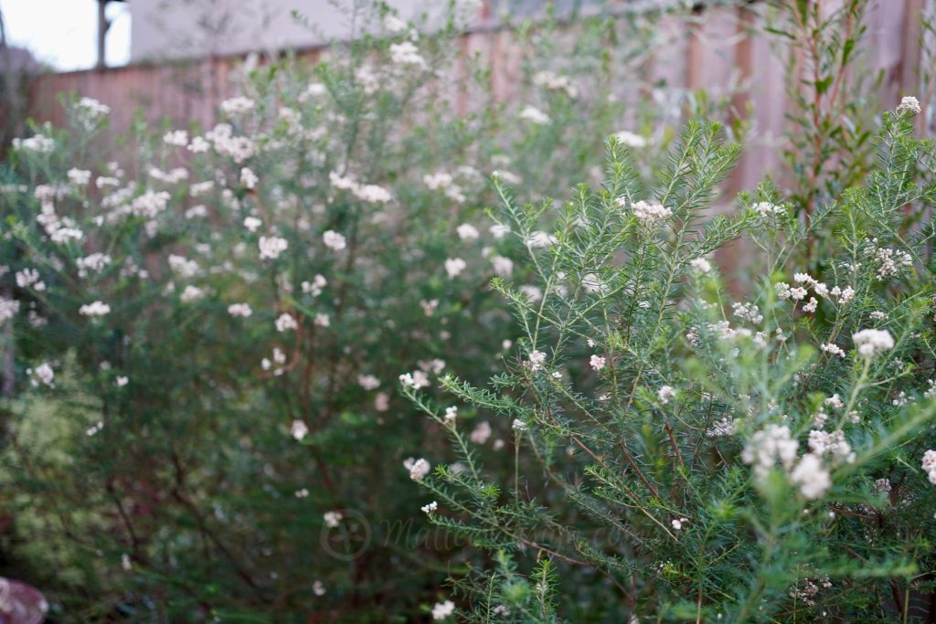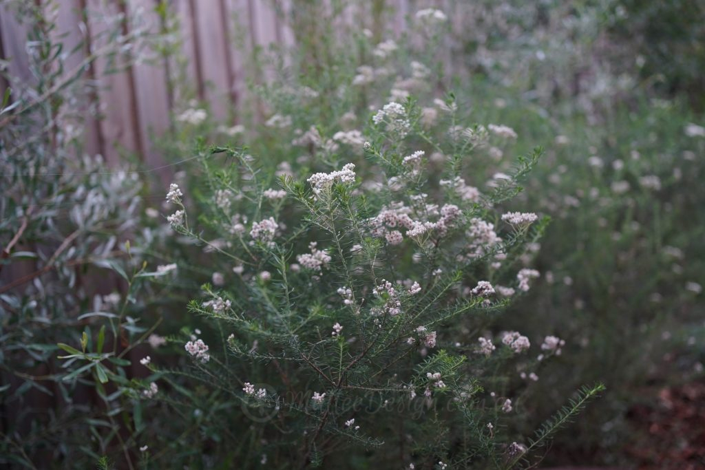 This is Ozothamnus diosmifolius ‘Radiance’ and they started flowering almost as soon as I planted them, to begin with tiny pink buds emerge on the end of every stem. They gradually grow and develop into a large cluster of 50 or more tiny flowers making a showy inflorescence, which positions its self almost horizontally on the stem. The leaf and flower arrangement is like no other native plant and the upright habit works well with weeping foliage and native grasses.