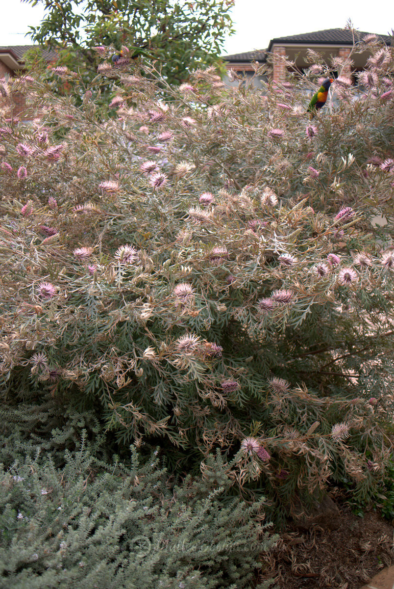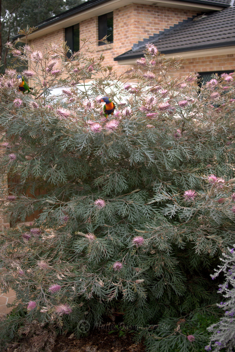 This is a Grevillea that can…screen out neighbours, fill an empty hole quickly, attract nectar feeding birds, give privacy, flowers profusely and is quite unusual looking. I would say its closest cousin is Grevillea ‘Strawberry Blonde’ another favourite of mine which also has bronze new growth and a large toothbrush flower spike.