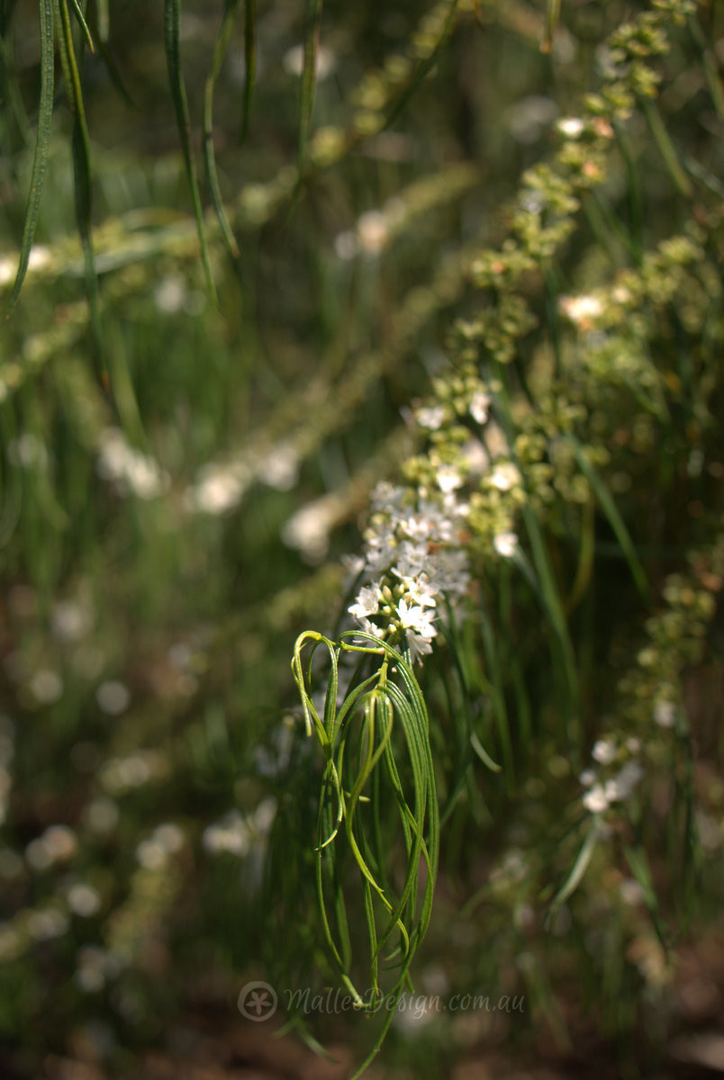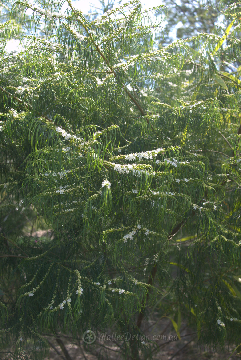 Myoporum floribundum is perhaps one of the most droopy native plants I know of and at its most showy when in flower, its tiny white flowers cover the stems like light snow in spring and summer. A range of insects are attracted to the flowers and these in turn attract insectivorous birds.
