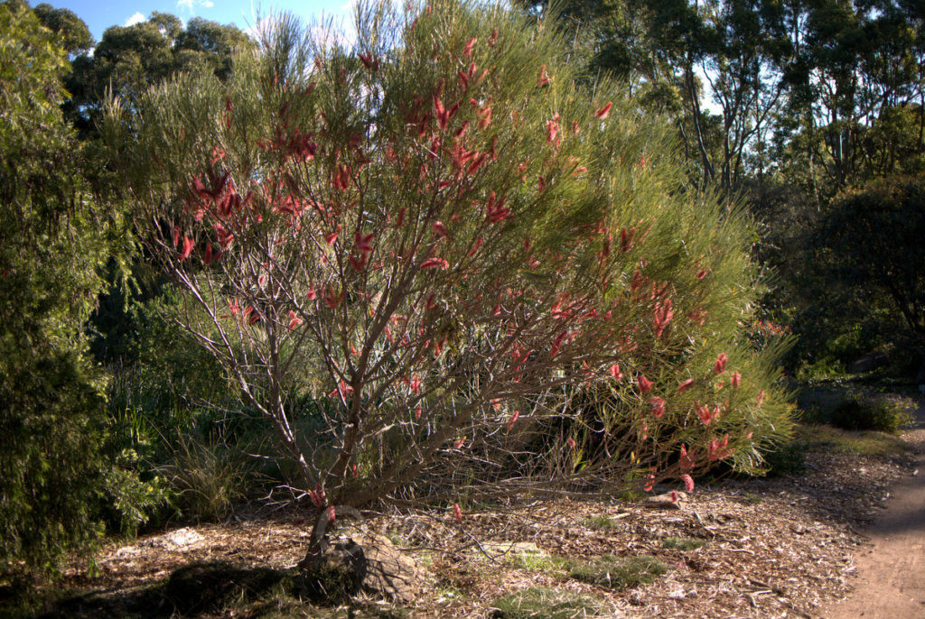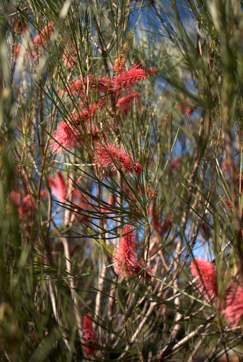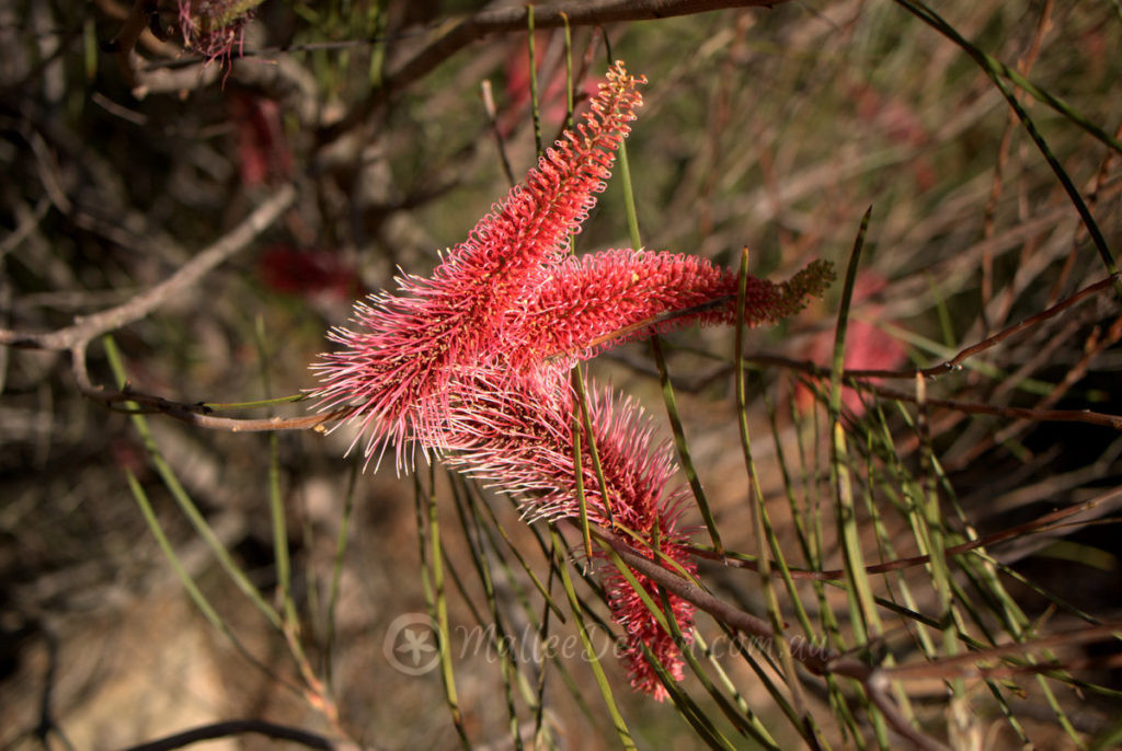 OK, so its not really red, its hot pink but it is poker like…and very showy, this is Hakea bucculenta another wonderful WA species that has been successfully grafted to grow over here in the Eastern States. If you provide it with lots of sun, a well drained soil and not too much wind it will reward you with gigantic flowers from Winter through to Spring.