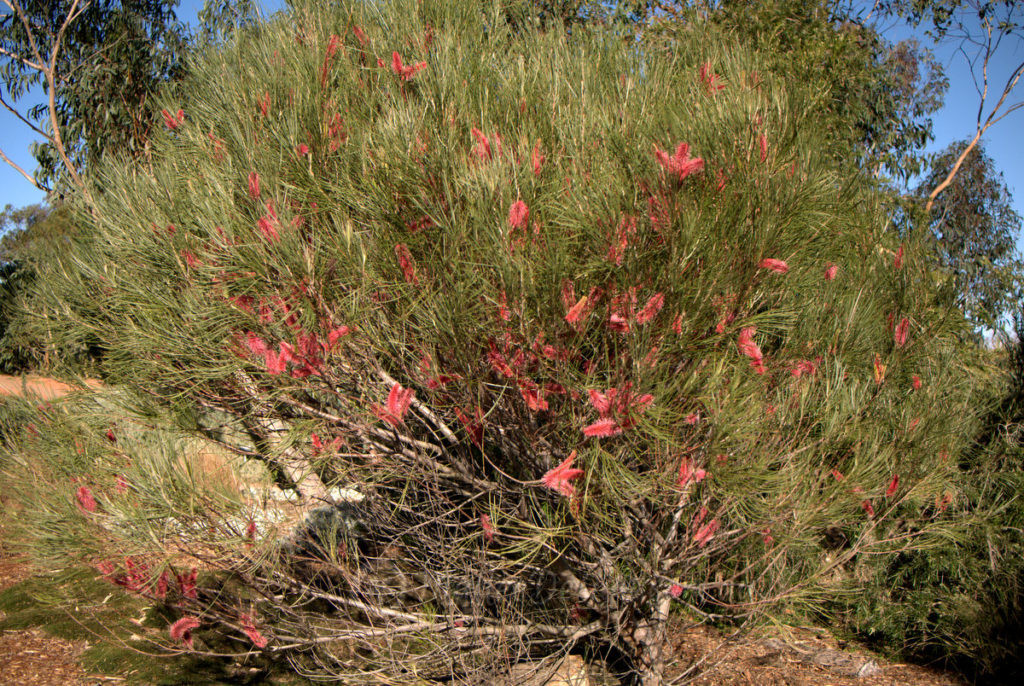 The leaves are another great feature, they are long and thin and a lovely grey-green colour. Hakea bucculenta has a great habit with a low trunk and domed open crown. It works well as a small feature shrub and fits nicely under power lines in nature strip plantings.