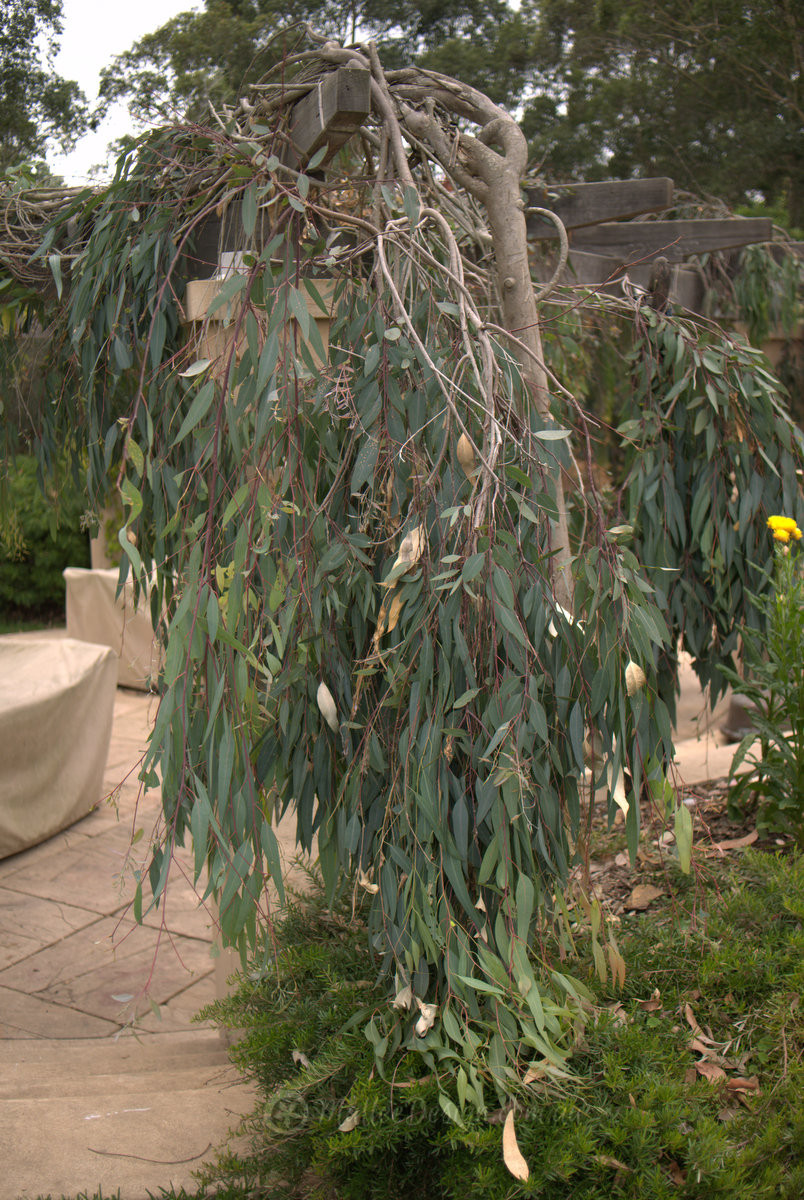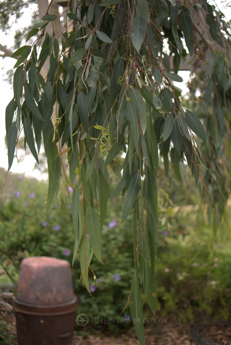 Eucalyptus camaldulensis ‘Blue Veil’ is a grafted variety of Eucalyptus camaldulensis or the River Red Gum. It is basically a ground cover Eucalypt that has been grafted for hardiness, often when you buy them they have also been trained up a stake so can appear to be a small VERY weeping tree.