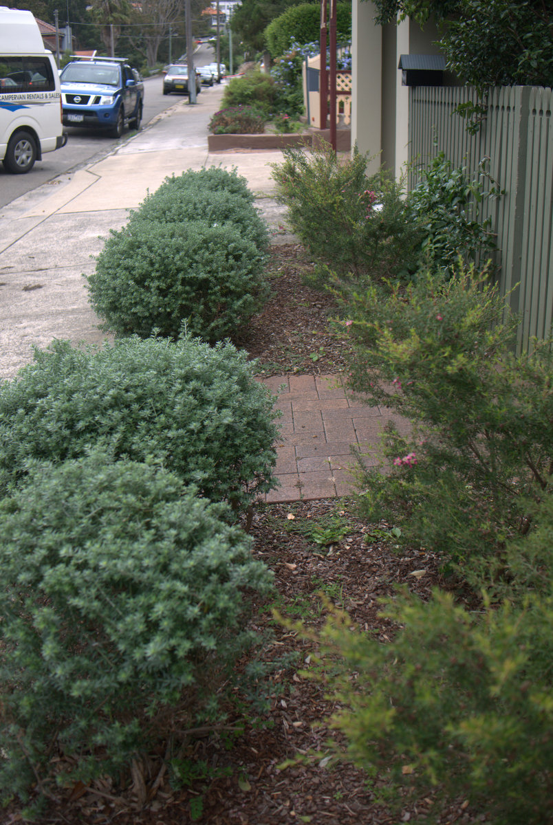 This is a rather striking entrance garden planted in front of a picket fence, right next to the footpath. There is a row of Westringia spheres followed by the contrasting soft weeping habit of Leptospermum ‘Pink Cascade’, it works so well. It give the more private garden behind the fence a sense of intrigue and also addresses the street giving passersby something to look at and a hint of what may lay inside.
